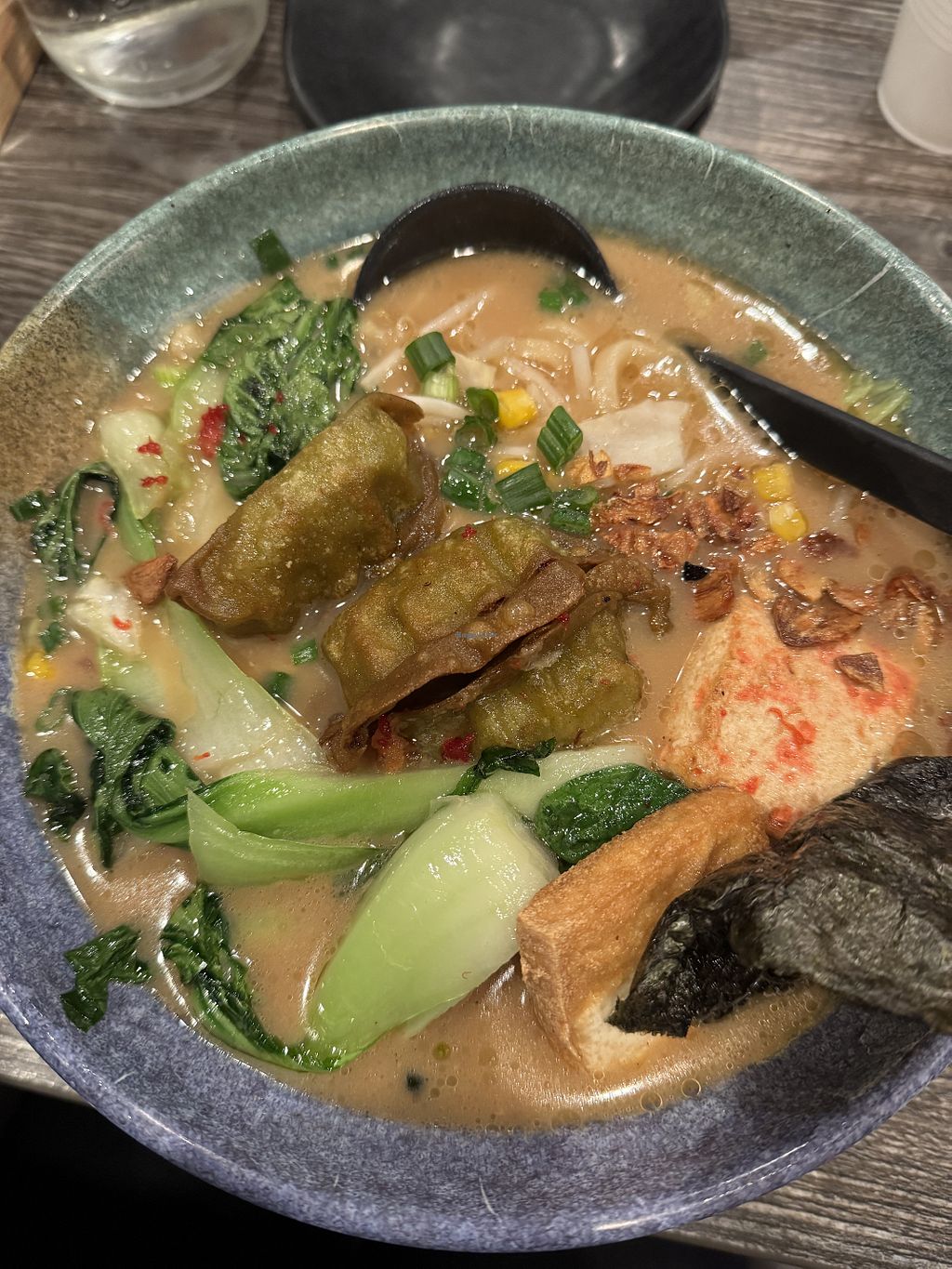 Super flavorful broth, with layers of depth, flavors and textures, that complement each other well. Love the baby bok choy, slices of fried garlic and especially the fried potstickers of onion and green onion. I prefer the spicy garlic vegan ramen vs the vegetarian. The spicy level is a 7 out of 10.