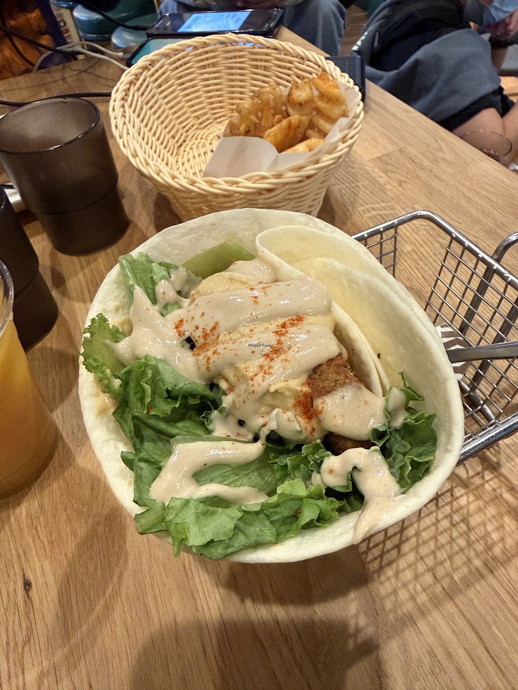 Very American style place, maybe not what people would choose first while in Japan. But nice to have options if you are craving something like that. Loved the waffle fries, loved baba ganoush. Was a bit hard to eat the sandwich.