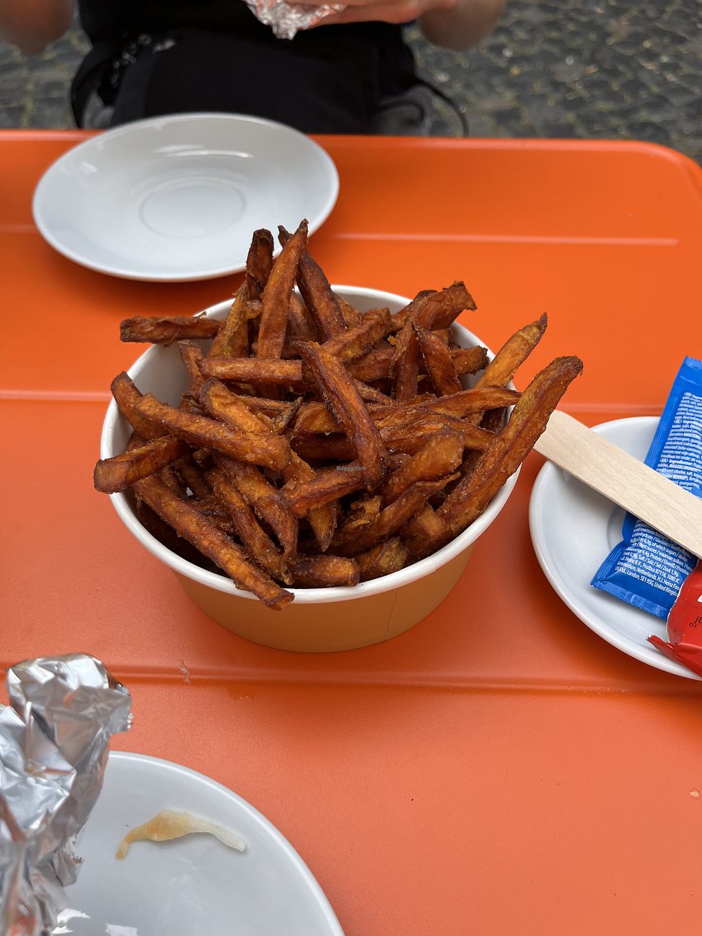 We shared one falafel sandwich with hummus and one portion sweet potato and were so full!! It might look small but half is enough ngl