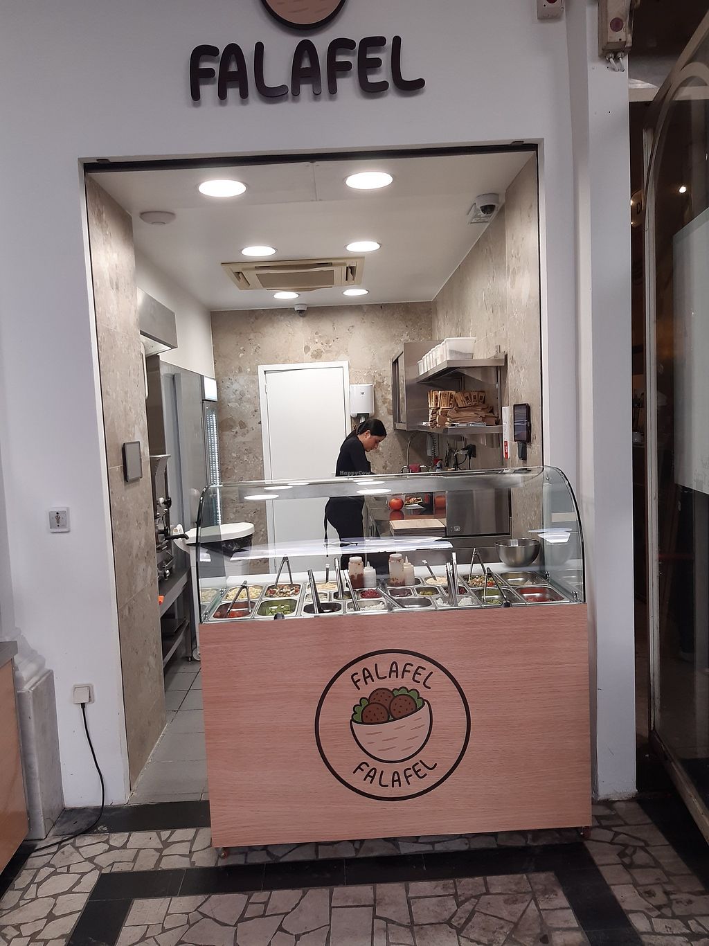 Vegetarian kiosk offering falafel with salads and sauces in pitta bread or bowls. Vegan options include falafel, houmous, gherkins, cabbage, and tomato. Outdoor seating available. Open Mon-Sat 10:00-17:00. Closed Sunday.