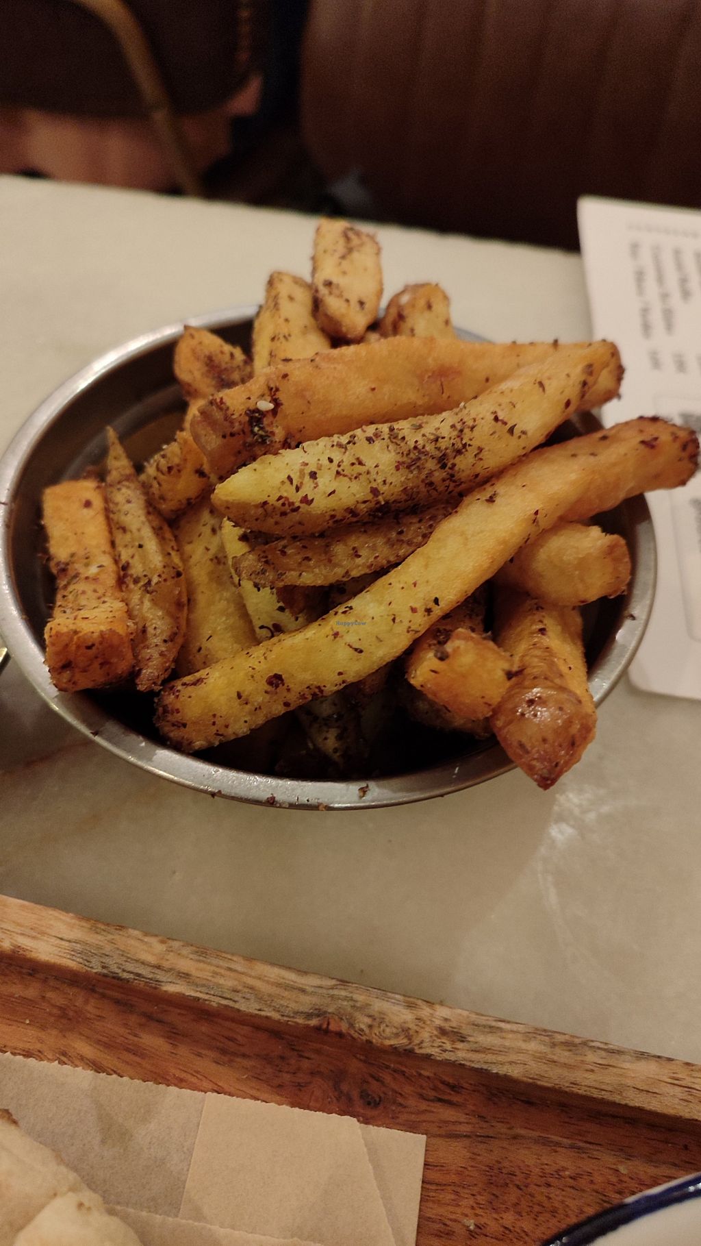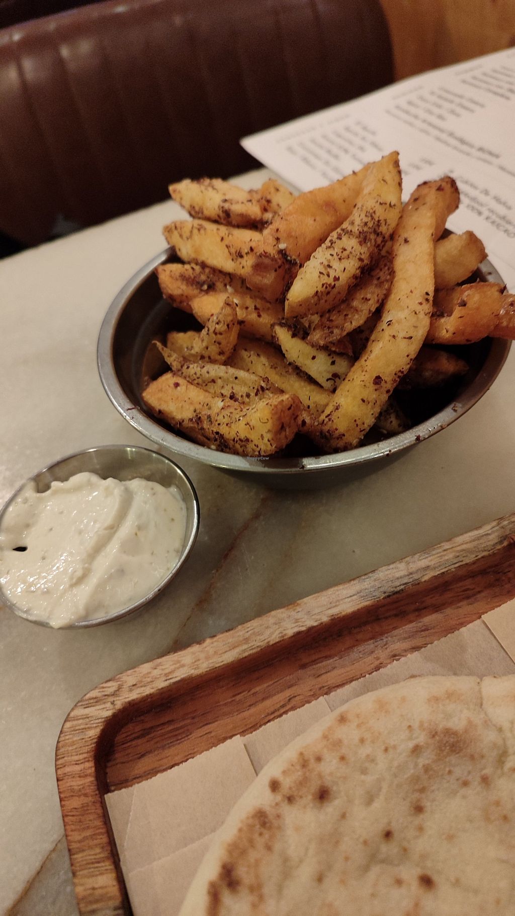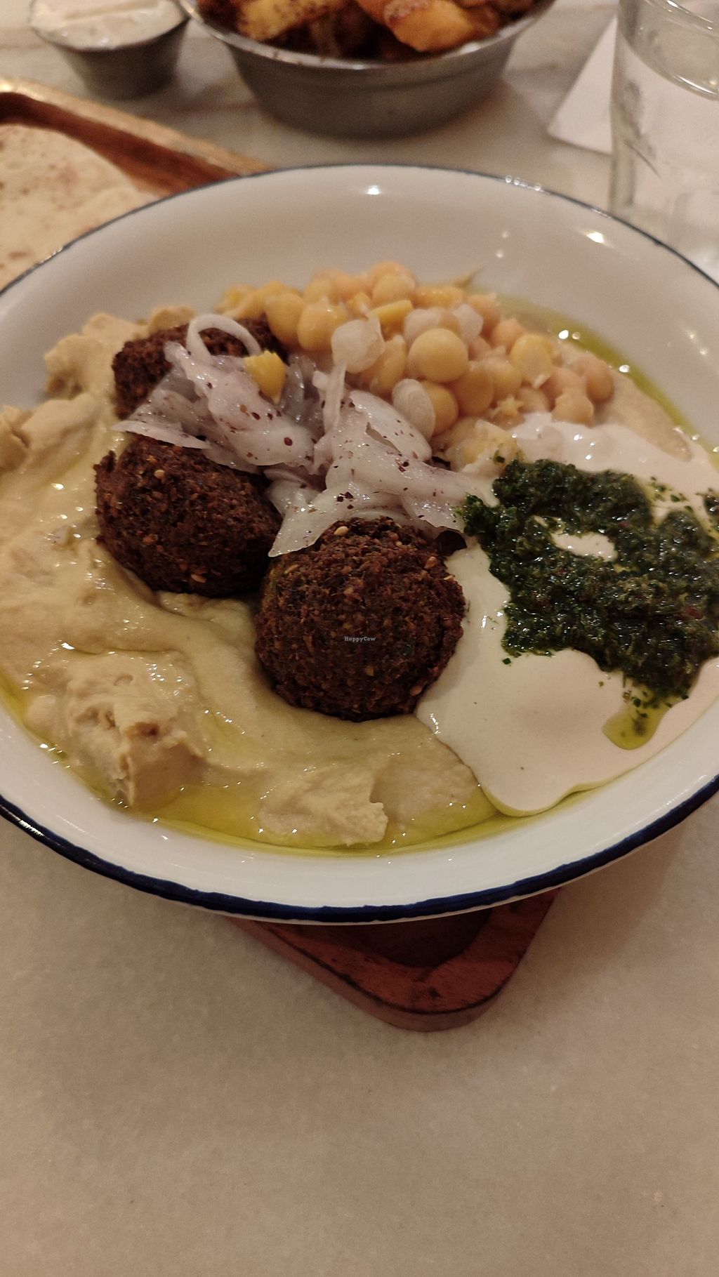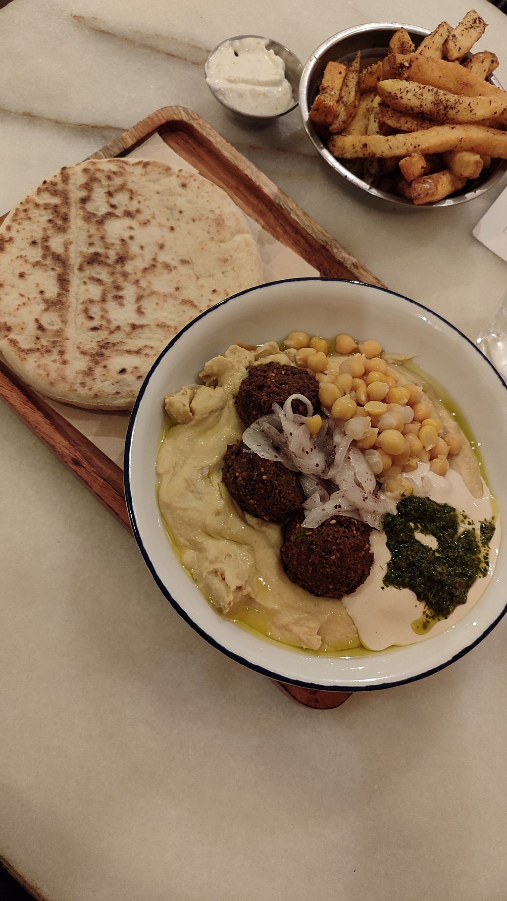 pedí para compartir las patatas con alioli y estaban buenísimas, las especias tienen un sabor increíble y la salsa estaba muy rica. también pedimos hummus con falafel y el plato es bastante grande, el hummus es espesito y muy bueno.
