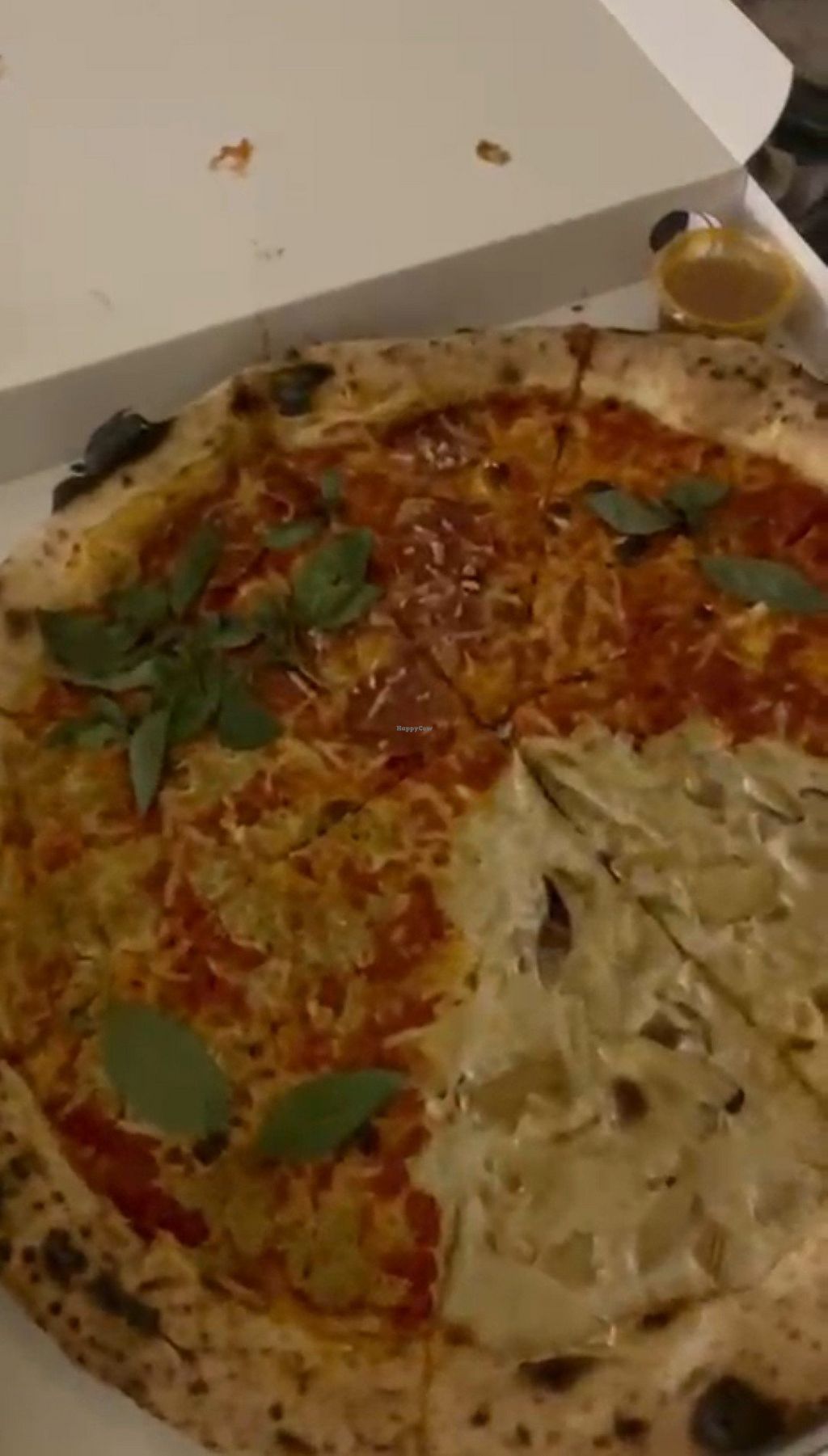Huge pizza to share! My husband had half regular mozzarella and my half was in two sections = one mushroom truffle and the second beyond burger! Very interesting! Fab rest and lovely staff. Super trendy area, do follow dinner by a drink in the 70s themed bar next door!