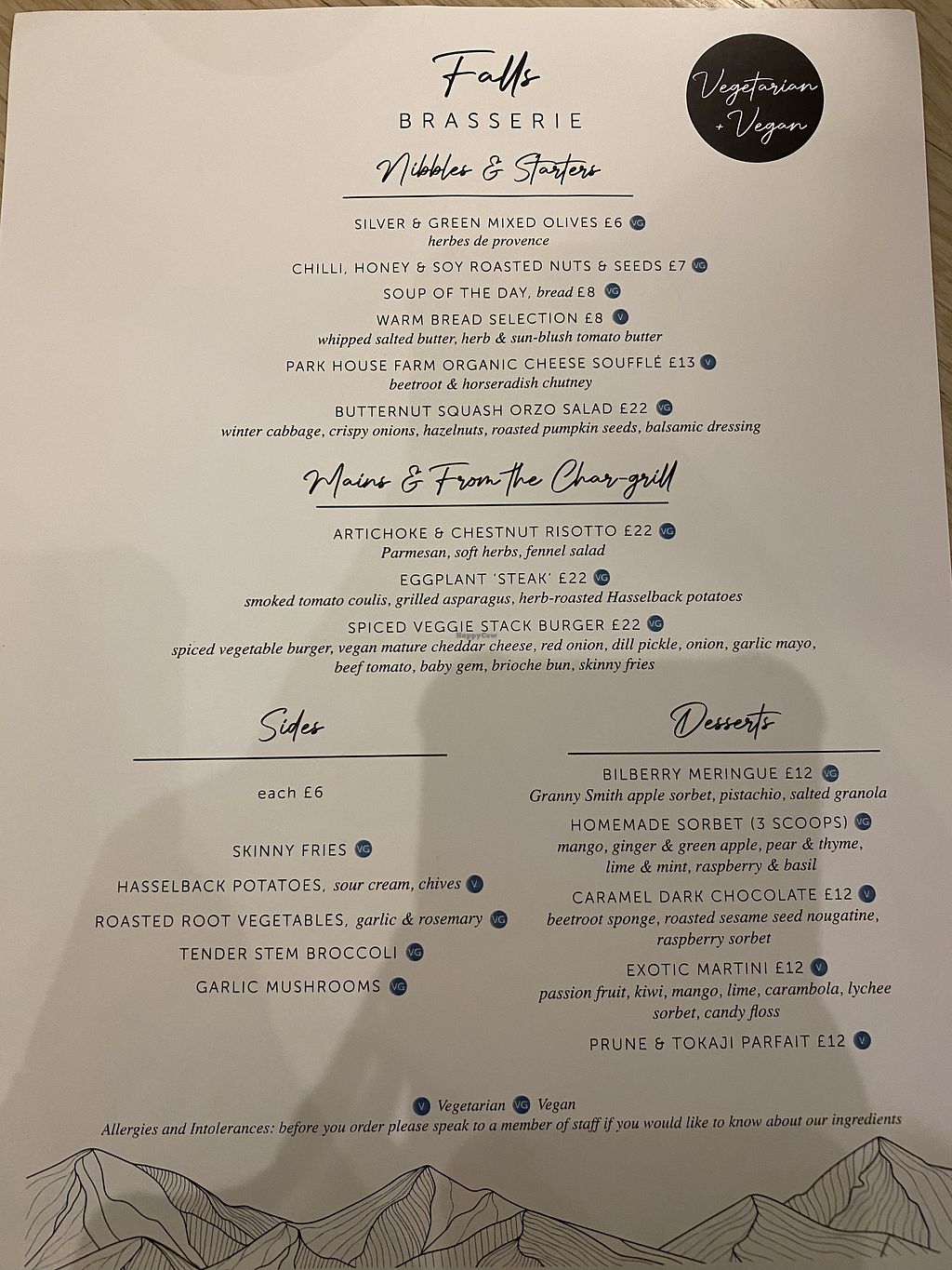 Serves meat, vegan options available. Brasserie located in the Lodore Hotel & Spa in the Lake District. Has a separate vegan menu that includes dishes such as vegan burger, risotto and butternut winter salad.
