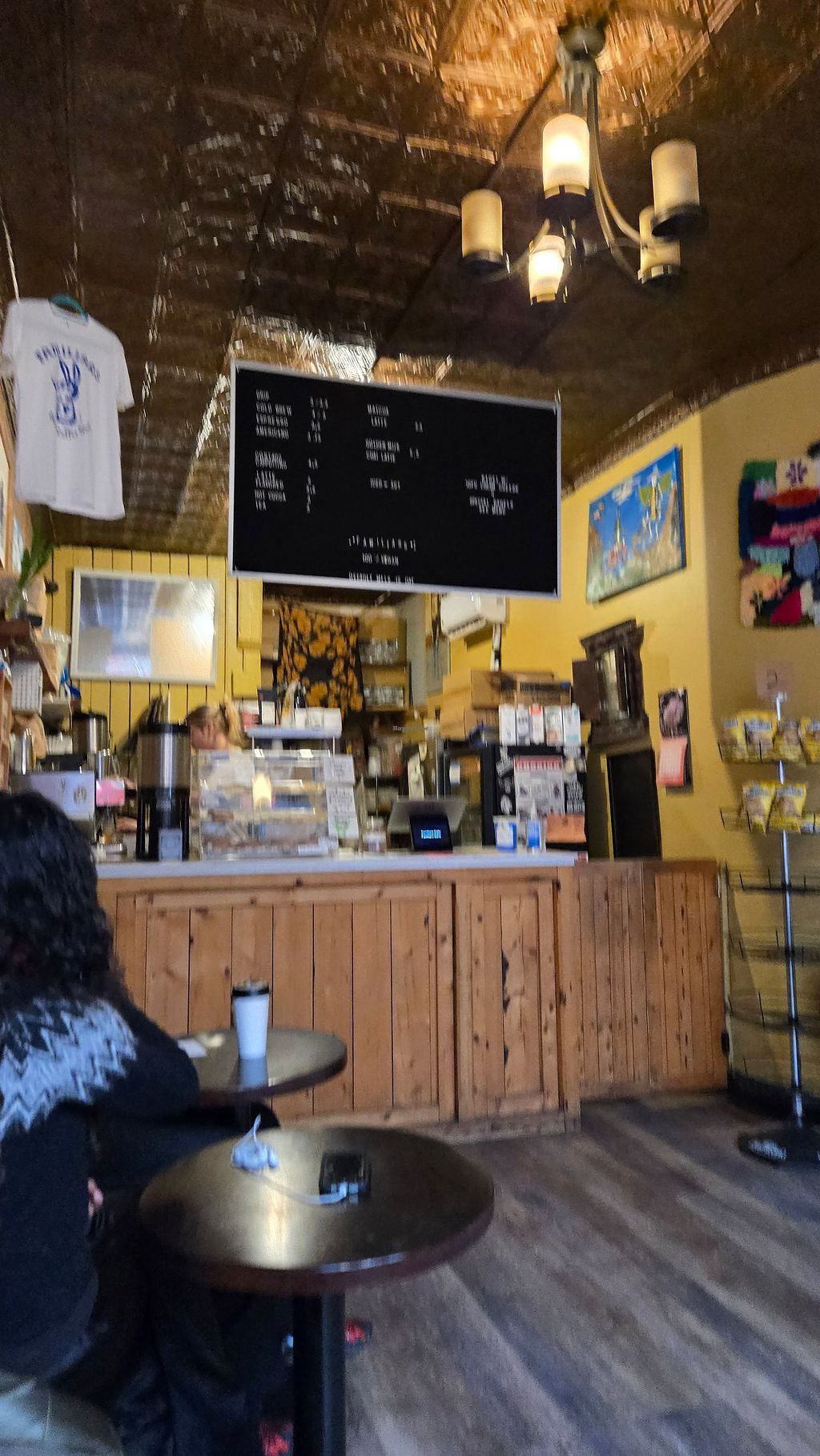 This is an all vegan coffee shop. WiFi is available. They also do bagels, doughnuts (and other desserts), and a noodle soup. Music was at a good volume and seating was comfortable. There is limited seating but enough to enjoy a coffee and dessert. They have some vegan dog treats as well which are homemade. Very nice staff as well.
