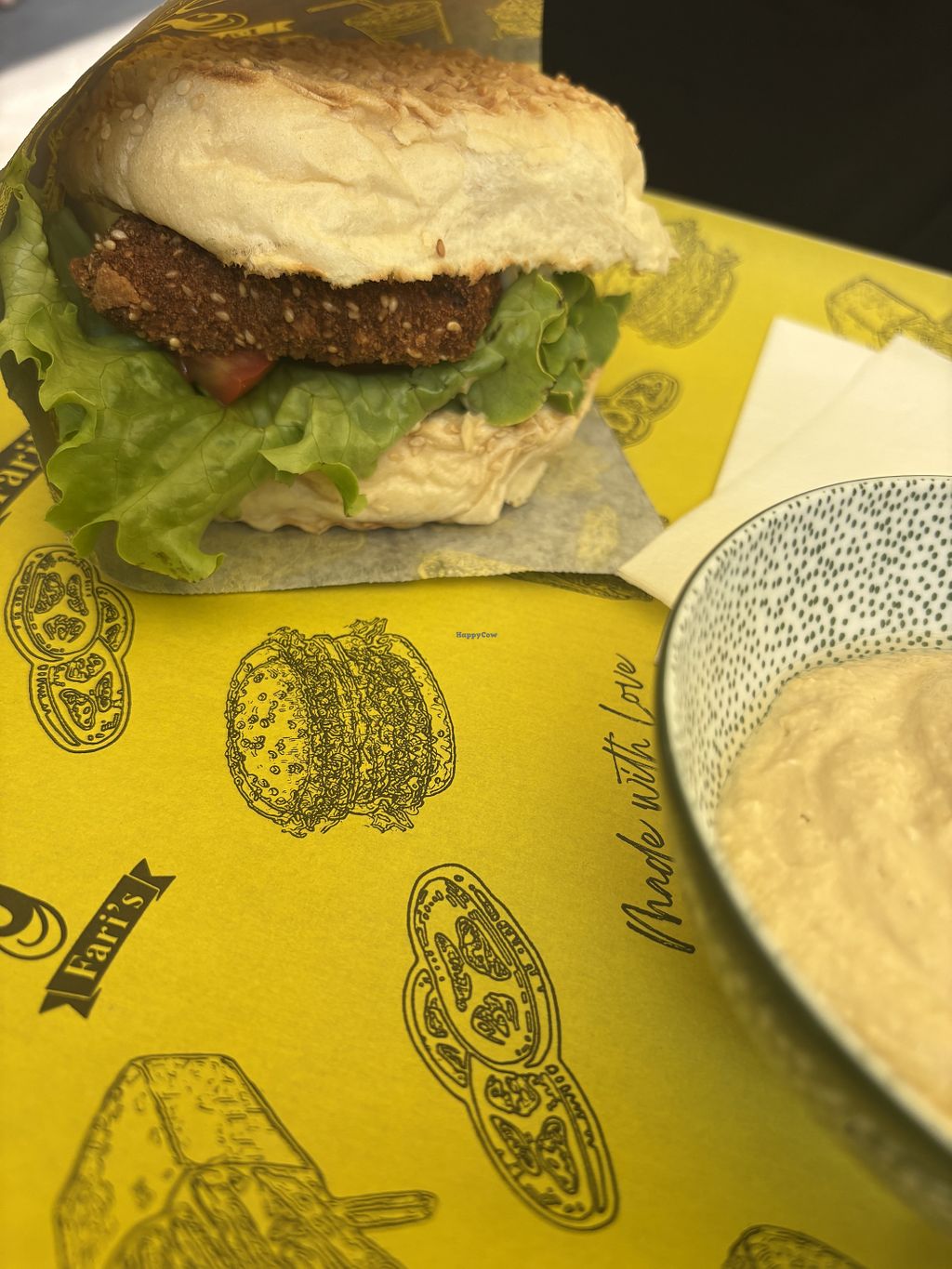 Serves meat, vegan options available. Fast food restaurant serving clearly marked vegan dishes. Vegan offer includes wraps, pitas, burgers, and salads with falafel, plant chicken, plant fish, Beyond meat, and plant mozzarella fillings. Also serves vegan snacks, sandwiches, sides, baklava, and mezze platter. Open Mon-Sun 10:00-00:00.