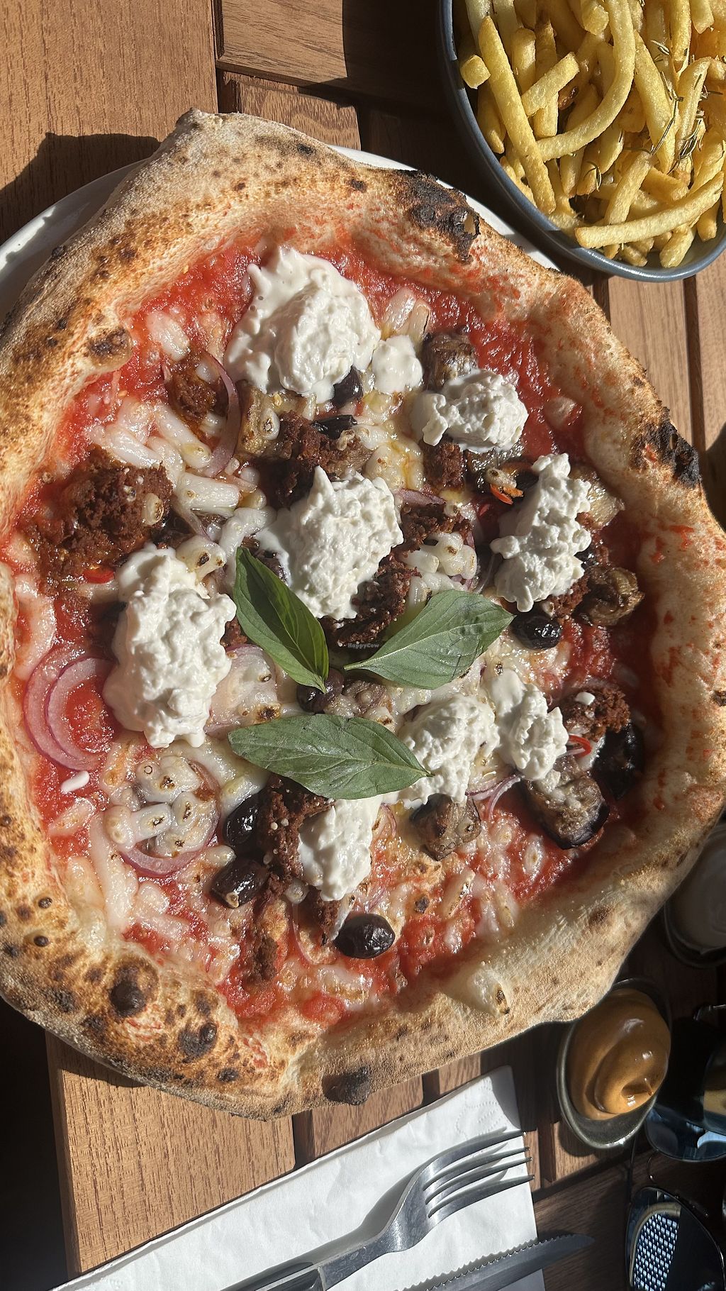 Serves meat, vegan options available. Pizzeria offering two vegan pizzas, salads, fries, and vegan dips. Vegan cheese options include mozzarella and burrata. All drinks are clearly labeled. Open Mon 12:00-21:30, Tue-Fri 12:00-22:00, Sat-Sun 12:00-22:30.