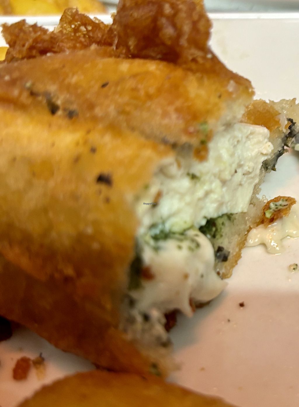 Tofish and chips with a dilly yogurt sauce and mushy peas