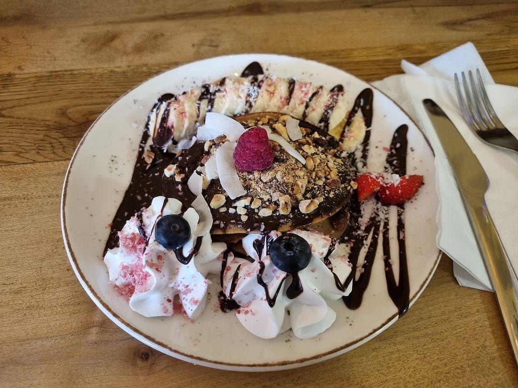 Read moreI had their hot chocolate and american pancakes with chocolate and nuts - and a generous amount of whipped coconut cream! It tasted good - but just not as sweet as when using refined sugar and I'm personally not thr niggest fan of coconut. I got quite full of this combo.