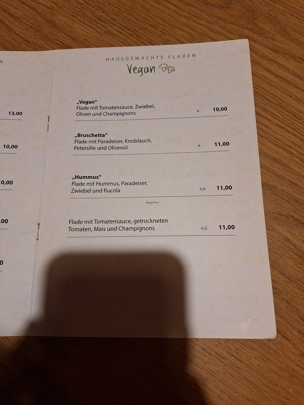 Serves meat, vegan options available. Restaurant serving two types of clearly marked vegan flatbreads with fillings such as tomato sauce, vegetables and mushrooms. Also offers the possibility to build-your-own flatbread. Open Mon-Sat 11:00-00:00, Sun 17:00-23:00.