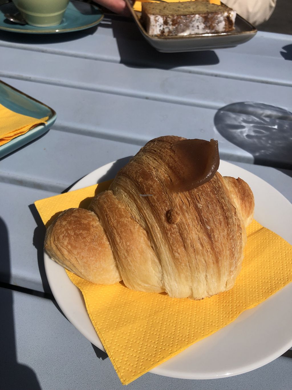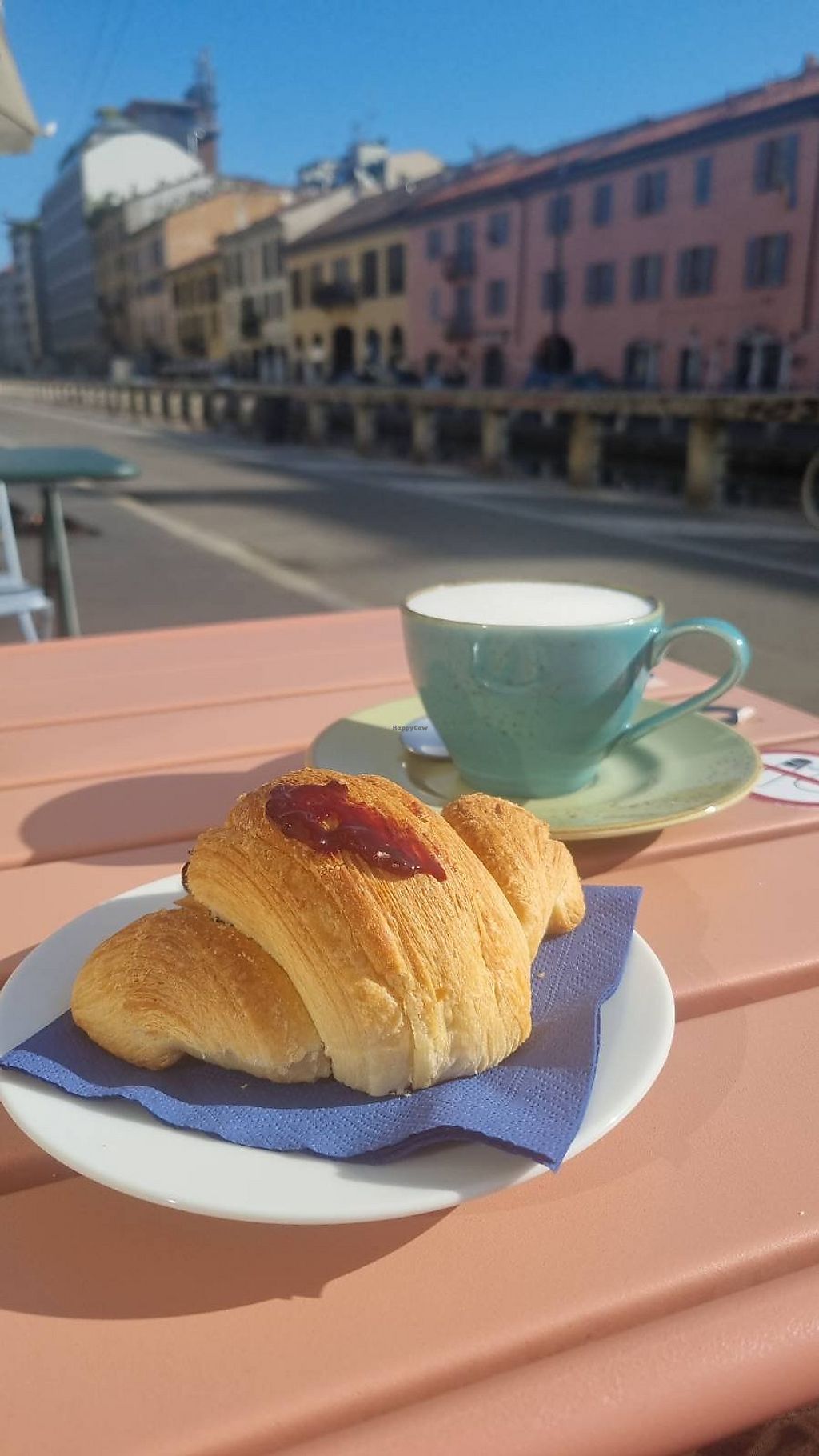 lots of vegan options, three different cakes and many options for croissants. three differnt plant milks for coffee. coffee and croissants were very tasty. lovely indoor seating with the plants, outdoor sitting next to the street and the canale. very nice person working.