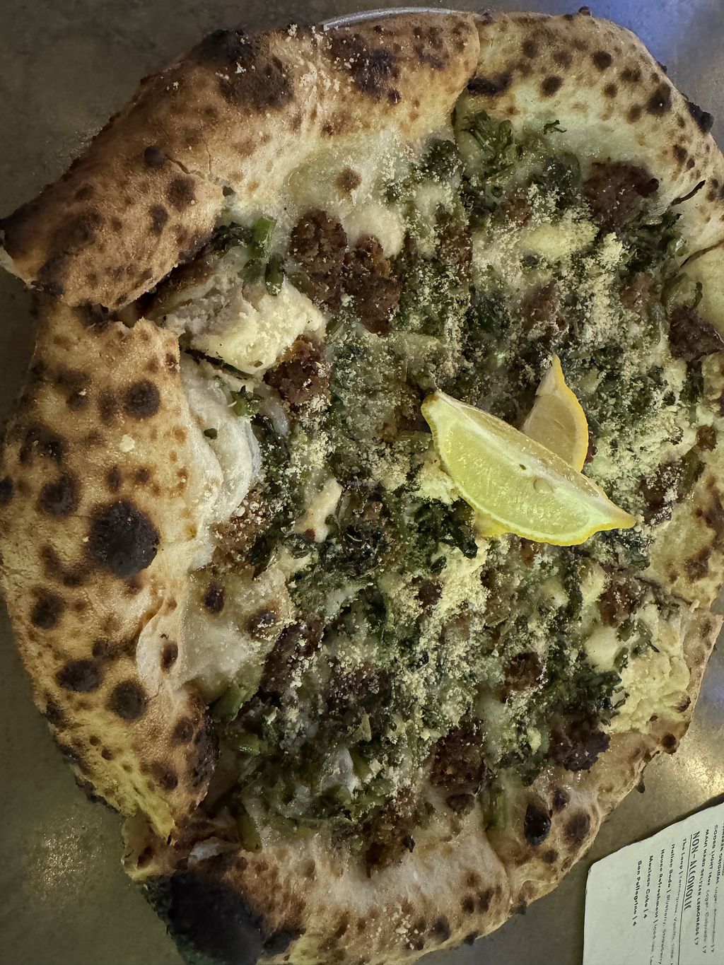 Read moreWe ordered three of the wood-fired Neapolitan style pizzas (I don't think we saw the New York style on the menu at the time), the Marinara (because my husband is wary of vegan cheese and wanted something to fall back on), the Paradiso, and the Pesto Royale. We also got a side of the Caesar dressing to dip the crust in, and I 100% recommend it! None of the pizzas were disappointing (even the Marinara one), but the Pesto Royale was probably my favorite, and the Paradiso was the favorite of my Mom and the husband by a landslide! Dad was tied between the Pesto Royale and the Paradiso, so we're definitely going to have to get that again next time, LOL. The crust is really authentic to other Neapolitan pizza places I've been to (don't be fooled by Yelp reviews lamenting burnt spots on the crusts, that's part of this style of pizza and they were absolutely doing it right), and the Caesar dressing as dipping sauce for the crusts was divine! (They also have marinara and a vegan hot honey sauce, which we may need to also try next time... Or just get a second dipping cup of Caesar, it's so good!)