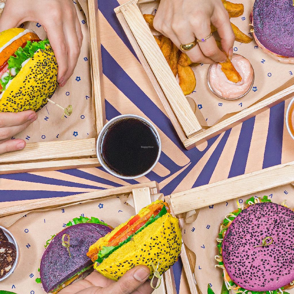 Delicious 2 different burgers and fries and spicy sauce and Flower Bom…