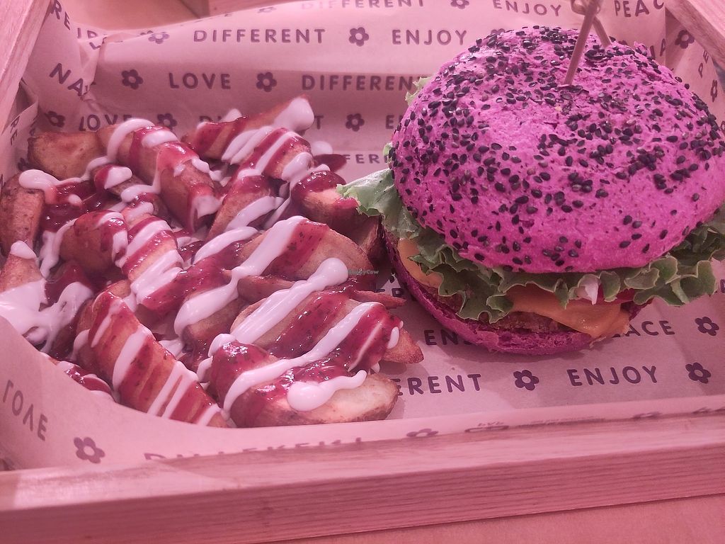 Great menu with colorful burger, potatoes and spicy sauce. Ottimo me…