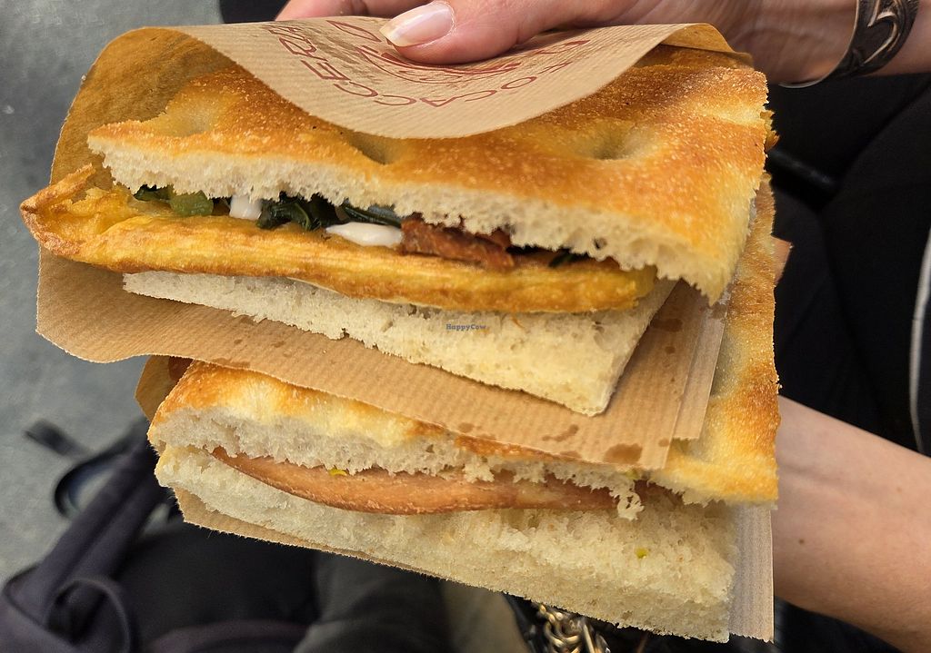 100%vegan place where they sell schiacciata filled with cecina (chickpea frittata) and other vegan ingredients such as vegan ham, salame, tuna, cheese and vggies. I tried pepino which was amazing. The focaccia is crispy and salty and the filling so flavourful. The staff is so nice. They also sell very good kombuchas (I tried the luppolo one and it was super good) and few cakes/muffins and a vegan tiramisù. Highly recommend! I will probably come back many times as I work nearby:)