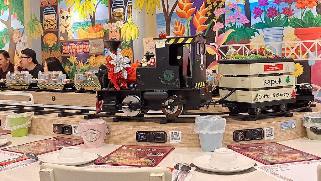 Hybrid of Italian pasta in Malay curry style pasta sauce. A cool little train taking some dishes around the tables.