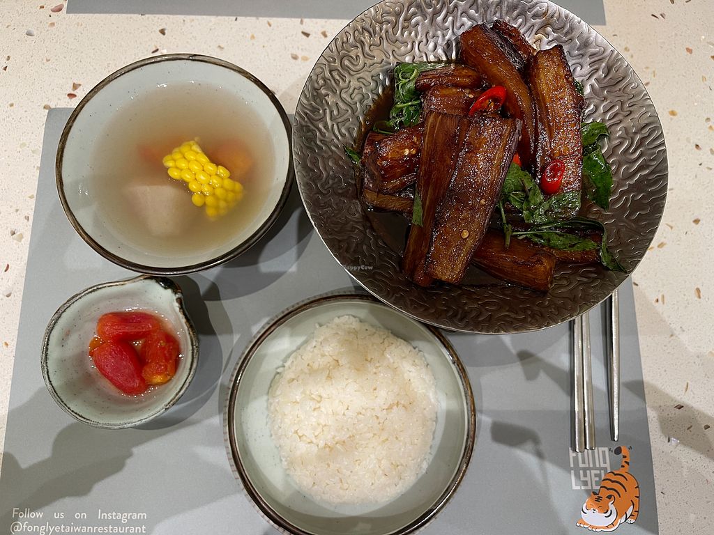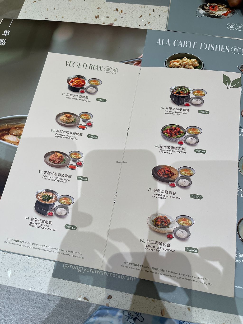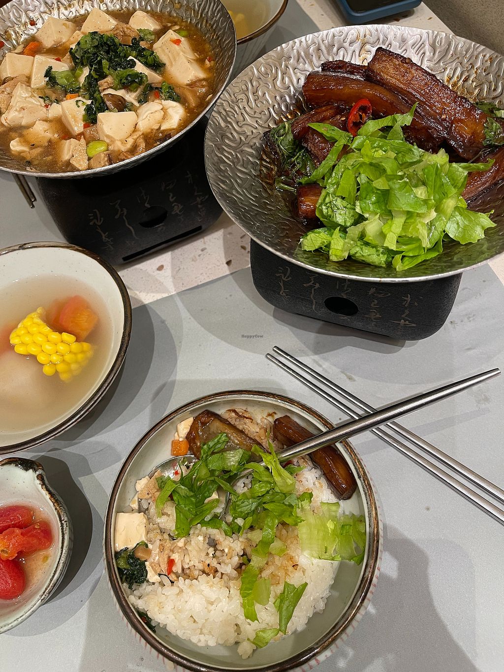 Serves meat, vegan options available. Taiwanese tea & coffee place that also serves lunch and dinner including rice, noodles, tofu, vegetables. Has a separate vegetarian set menu. Some of the items on the vegetarian menu are vegan or can be veganized such as special choy with beancurd veg chic, brinjal w basil leaf, bittergourd vegetarian set. Open Mon-Sun 11:00am-10:00pm.