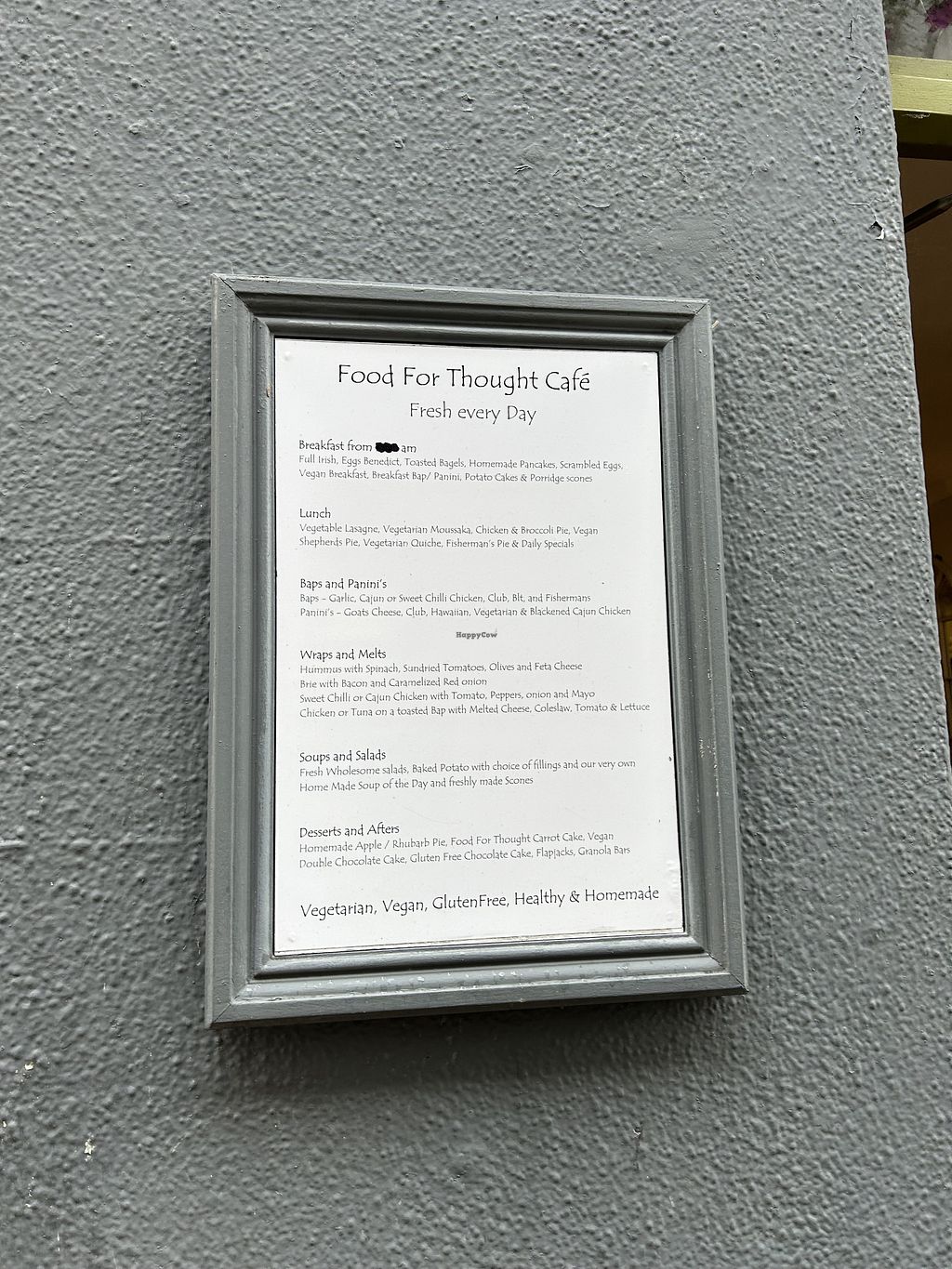 Food For Thought was a quiet, homey sandwich bar where people come in for a bit of food and tea to get out of the rain. It seemed like the perfect place to do some reading or homework.