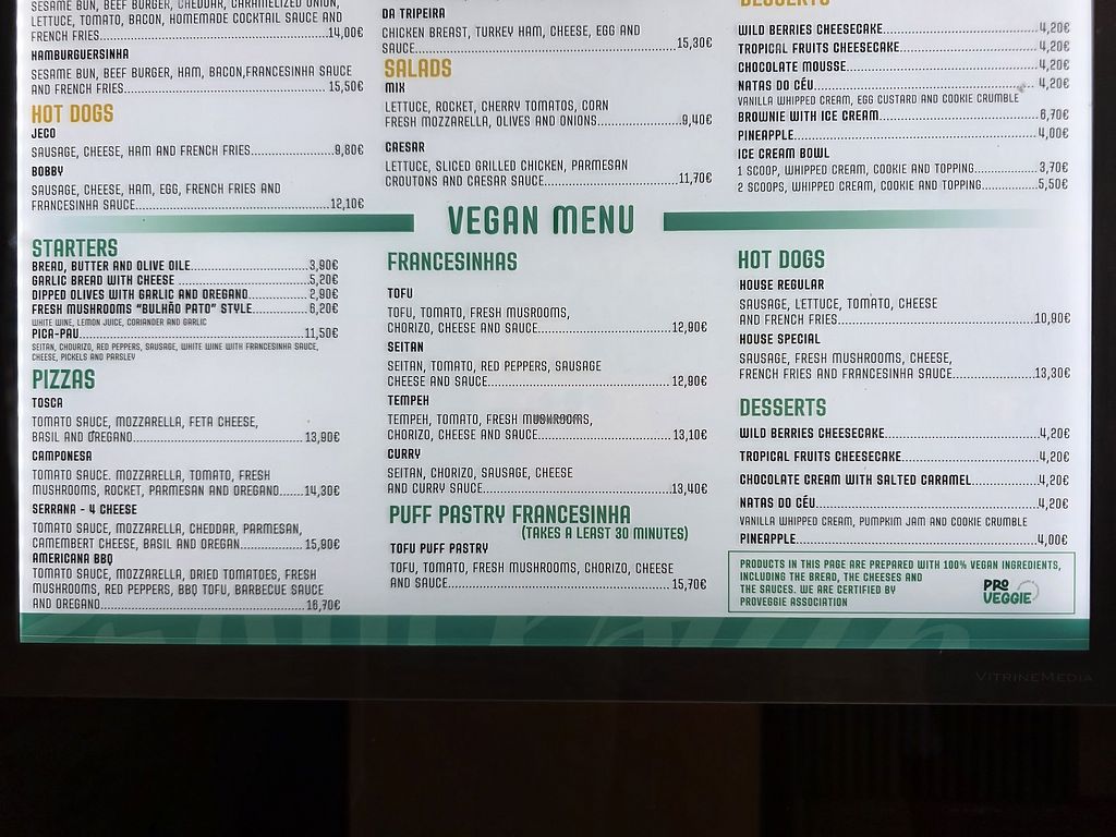 Surprisingly they have plenty of vegan options clearly marked as so on the menu. Starters, pizzas, hot-dogs, desserts, and the famous francesinha.