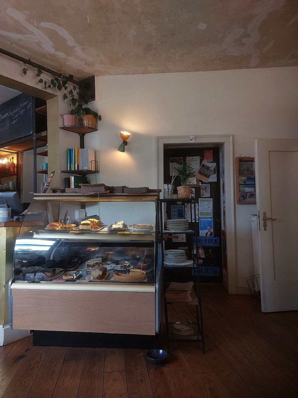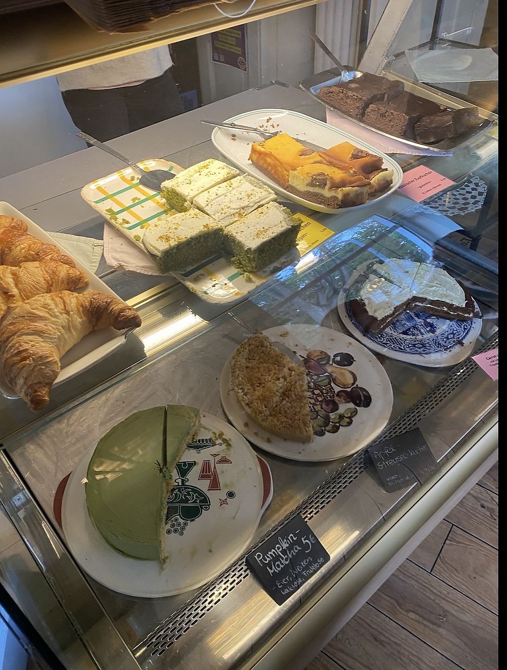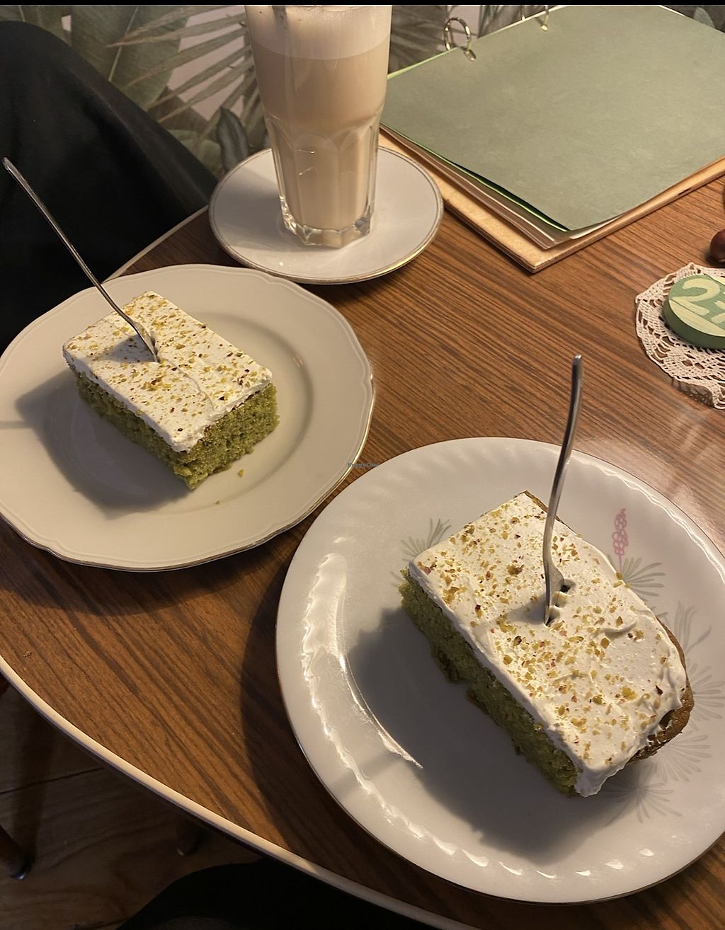 I was warmly recommended this café by a friend and finally got to try it. On our first visit, the selection of vegan cakes was quite small, which really depends on the day and the time. I had a pistachio cake - nothing extraordinary, but still tasty. We also shared a potato Flammkuchen, which was genuinely delicious. Unfortunately, I really didn’t enjoy the matcha latte at all: it was very watery and the matcha quality and amount were clearly lacking.