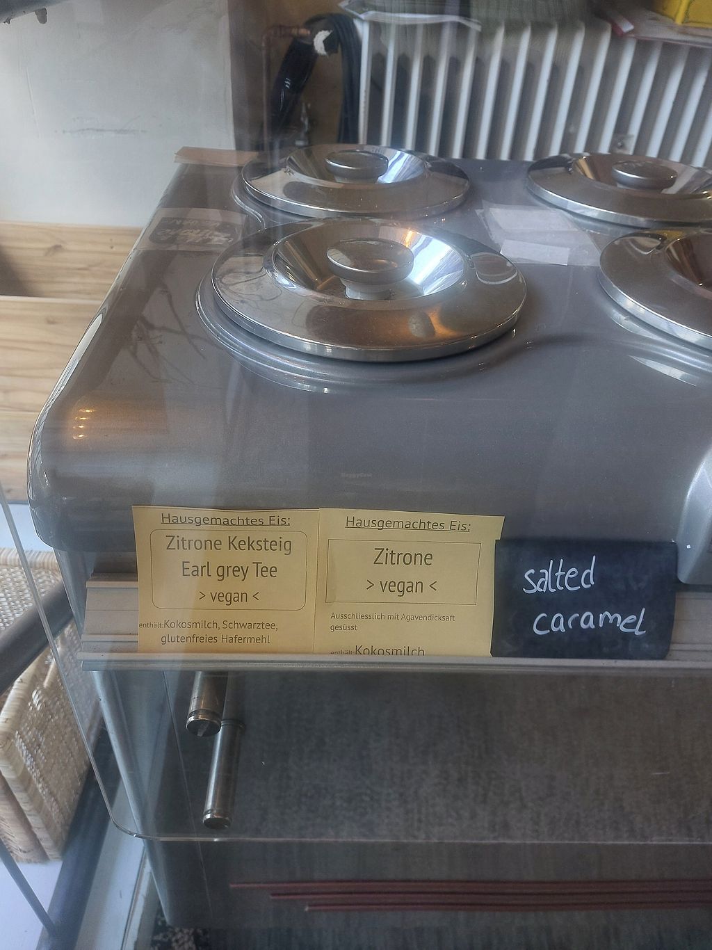 ah it's really such a shame sometimes when you can't give a non vegan establishment 5 stars, because Frau Friedrich is incredibly vegan friendly and would really deserve them. I can't believe I have missed out on this gem until now, it's definitely going to be my favorite café in Marburg from now on! It's not central but in a very beautiful part of town that is easy to reach by foot, lots of tables outside but also two rooms inside with many seats (still its possible to not get a seat since its that popular). Not only is majority of their cakes vegan and very creative, 90% of their icecream flavors are vegan, they vegan croissant and other pastries and ofc meals such as carrot lax ciabatta and flammkuchen. Incredibly delicious, fair prices for big portions, and a very beautiful atmosphere with pretty flower tableware. The only downside is that you can wait for your food for a long time, but that's also understandable since it's so full. I want to tey everything they offer! The carrot lax ciabbata was incredibly delicious, though so huge that I'd recommend only ordering it to share (of course you can also take leftovers to go). I really like their flammkuchen as well. The matcha latte and chai latte I personally wouldn't recommend, they're a bit watery and don't have enough flavour. The regular café latte & cappuccino I like though.