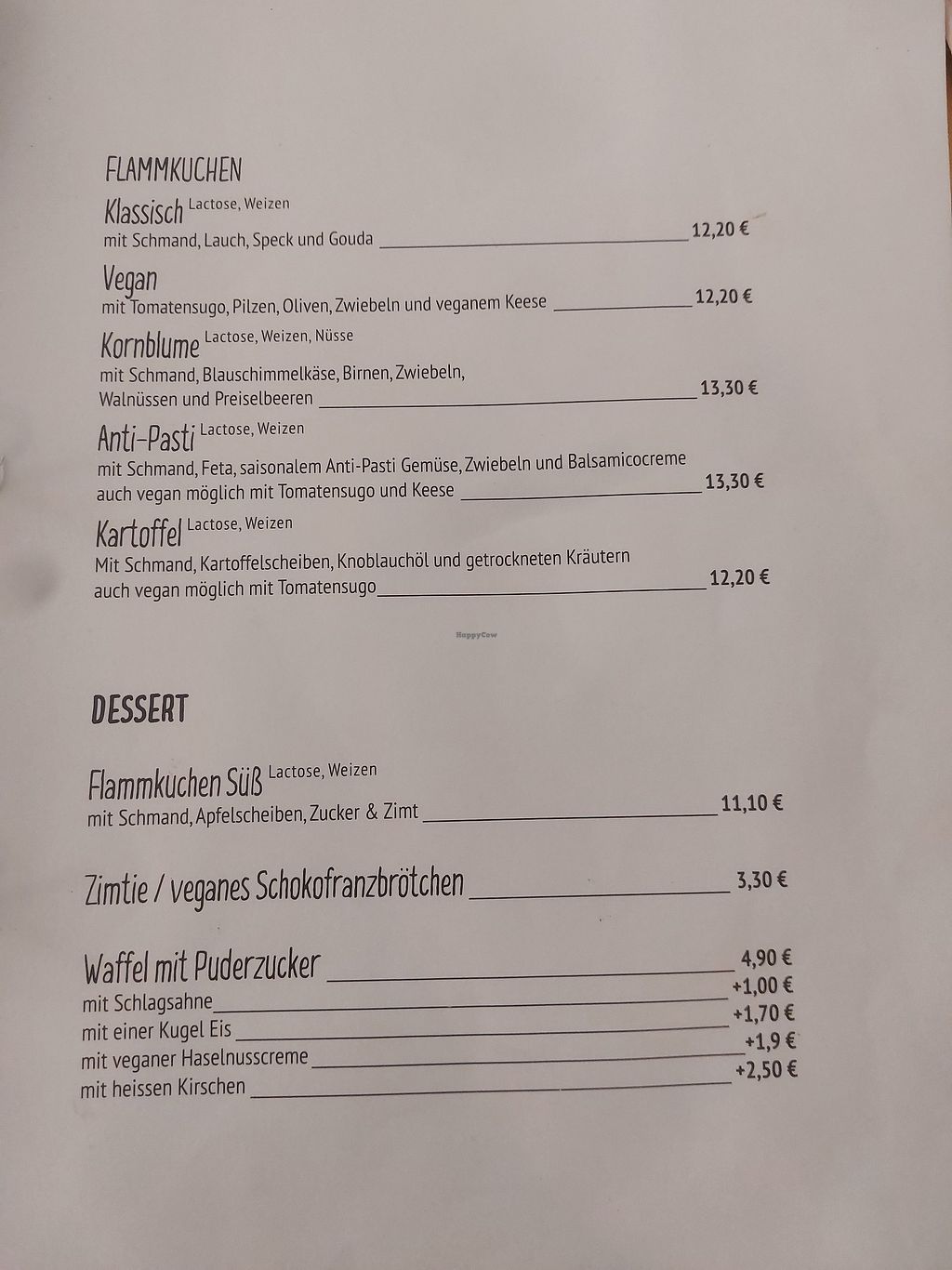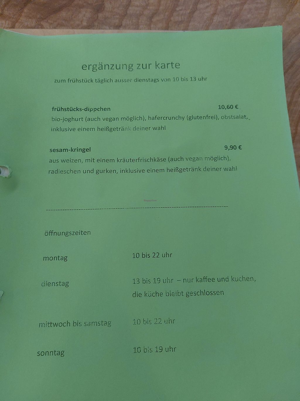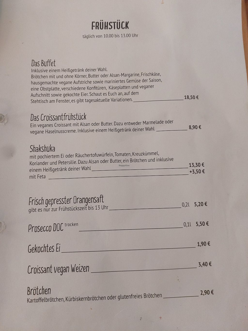 Serves meat, vegan options available. Café with vegan cakes and baked goods. Coffee drinks can be made with plant milk. Also offers a vegan breakfast, vegan croissants, flammkuchen (regional flatbread), salads, soups, and more. Open Mon 10:00-22:00, Wed-Sat 10:00-22:00, Sun 10:00-20:00. Closed Tue.