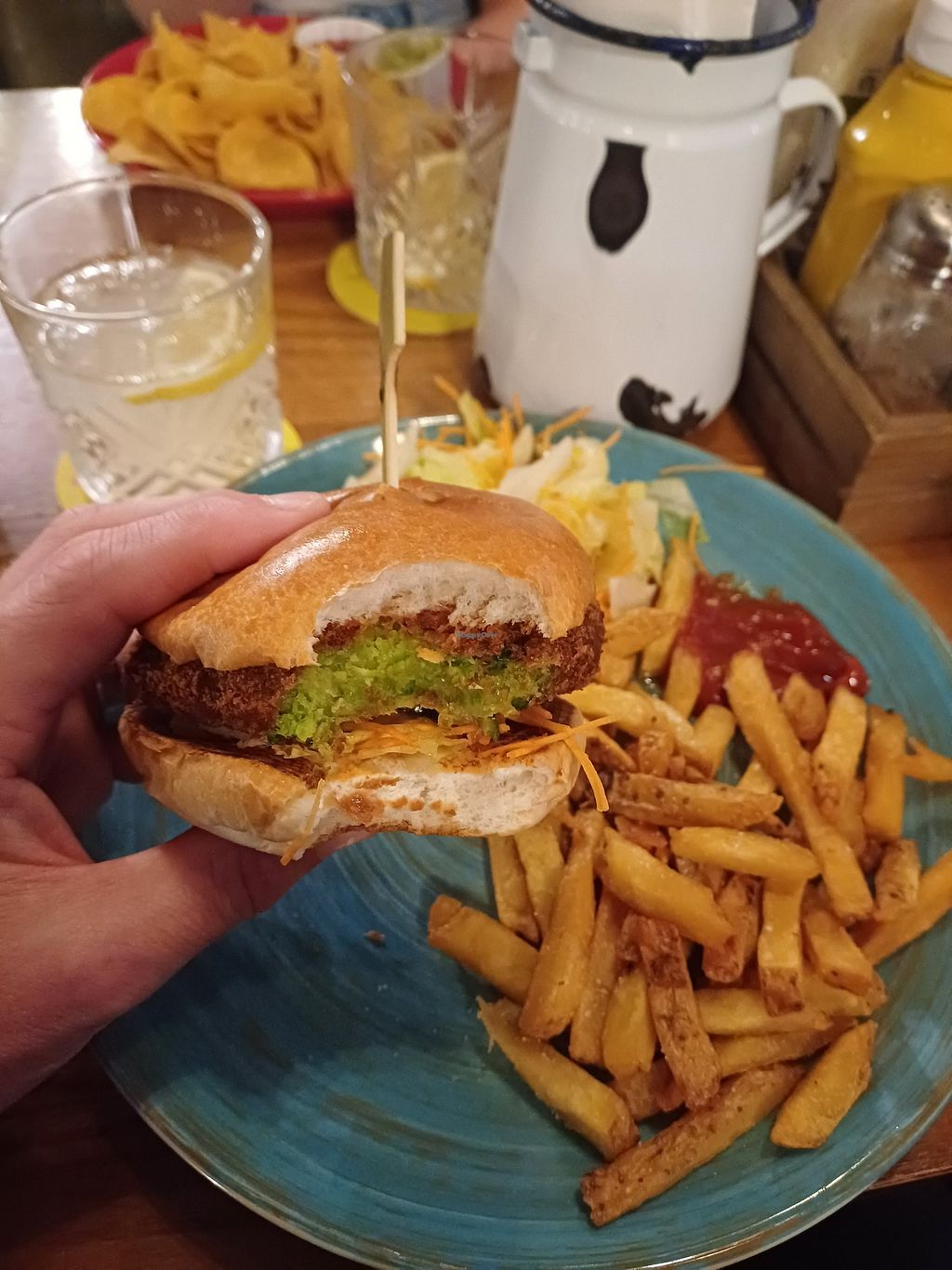 Was busy, service was very good, staff very helpful. Not many options for vegans, but burger was very tasty