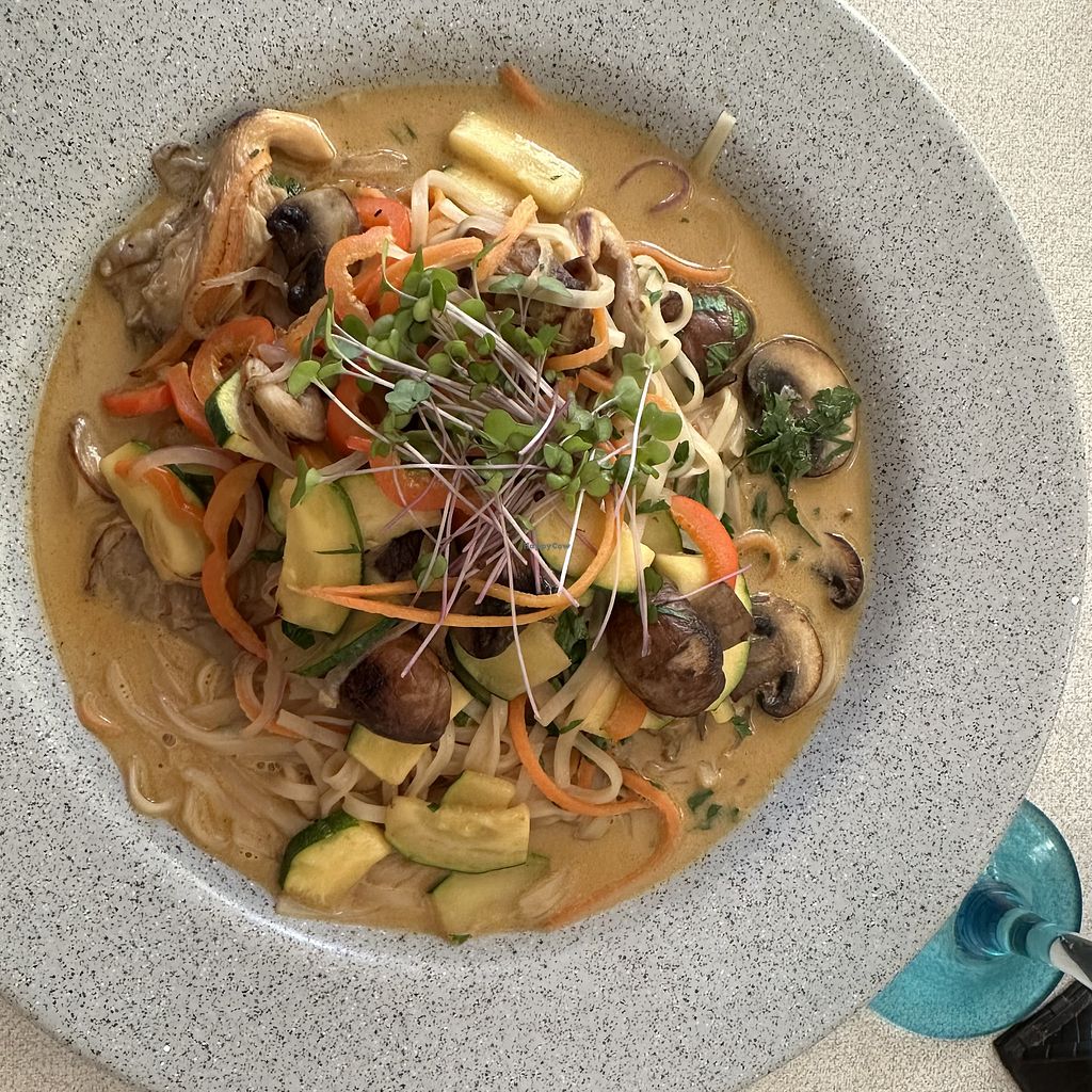 with coconut milk, mushrooms, tofu, side a rice. free pita bread appetizer. delicious taste, i added chili powder.
