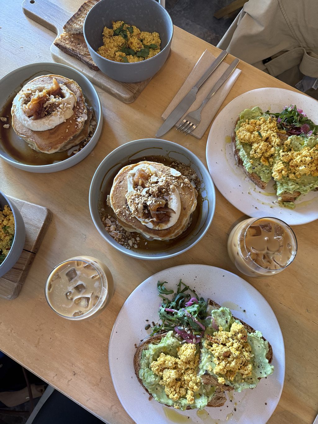 Pros: Pancakes , Avocado scramble eggs Brot , Iced latte