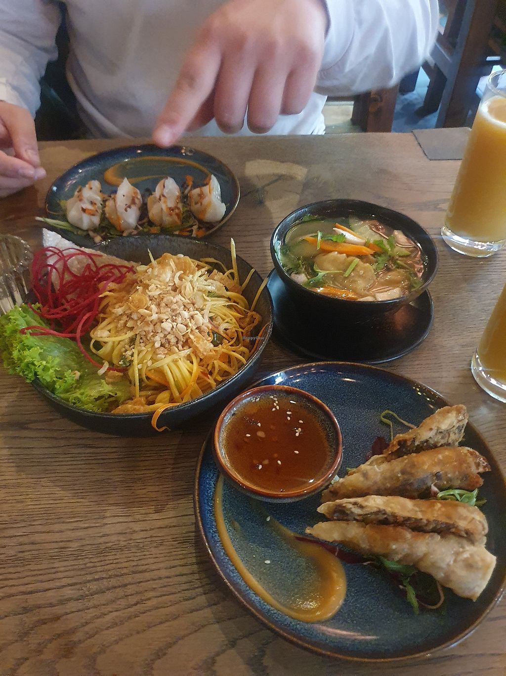 Wir hatten nicht so viel Hunger, haben also nur ein paar Appetizer probiert, aber die WanTan-Suppe, der Papayasalat und die Hühnchenspieße waren so so so gut. Die Getränke auch sehr erfrischend und nicht zu süß (Kumquats Limonade). Die Teller an den Nachbartischen sahen auch sehr sehr gut aus, wir kommen hoffentlich wieder! ♥️