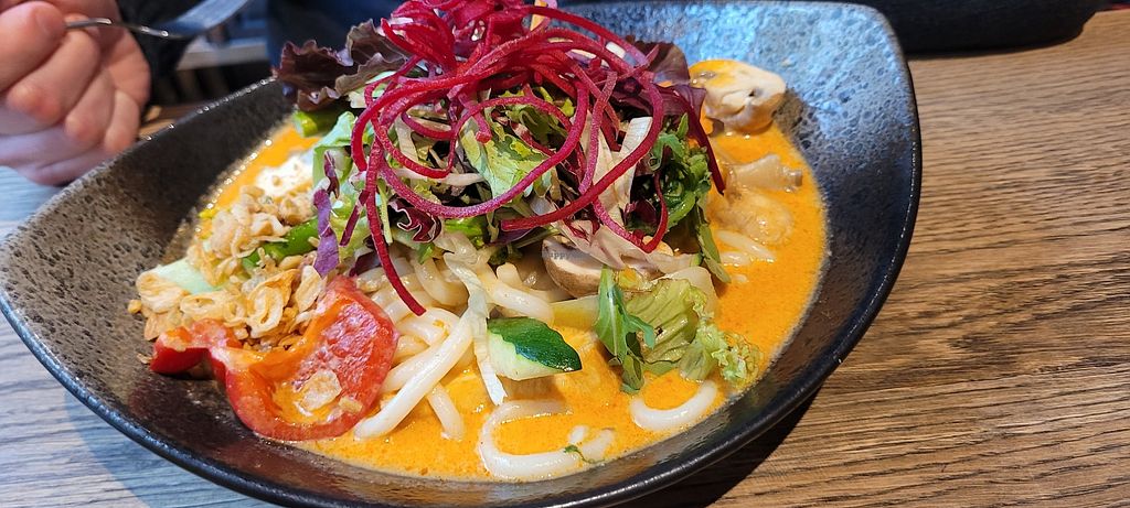 High quality, fresh. Many seats, certainly over one hundred, inside and outside. Since 2025 fully vegan. Three tram stops from central train station or a beautiful walk through inner city, i.e. through rebuilt old town & shopping are of Leipzig. Nice atmosphere. The main dishes are quite rich, I chose just starters and were full. Good tamarind soup which is rare in Germany. Bonus: Dishes can be prepared w/o onions etc. if you ask. Actual taste of actual ingredients. Pancakes, coffee etc. since 2025 are 100% vegan.