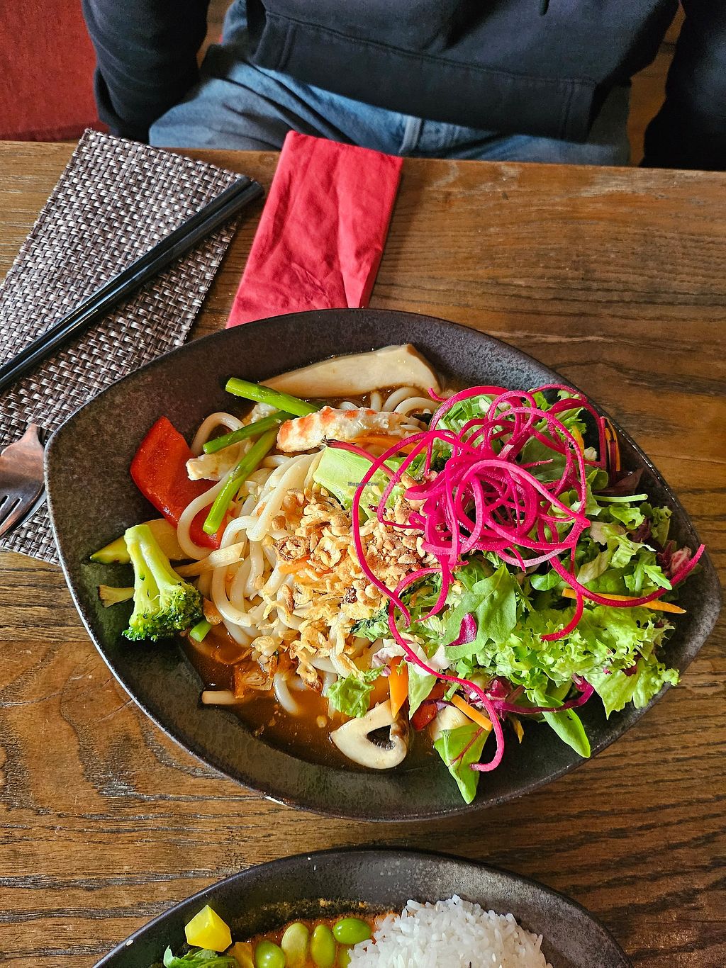 Spicy coconut udon with crispy seitan shavings.