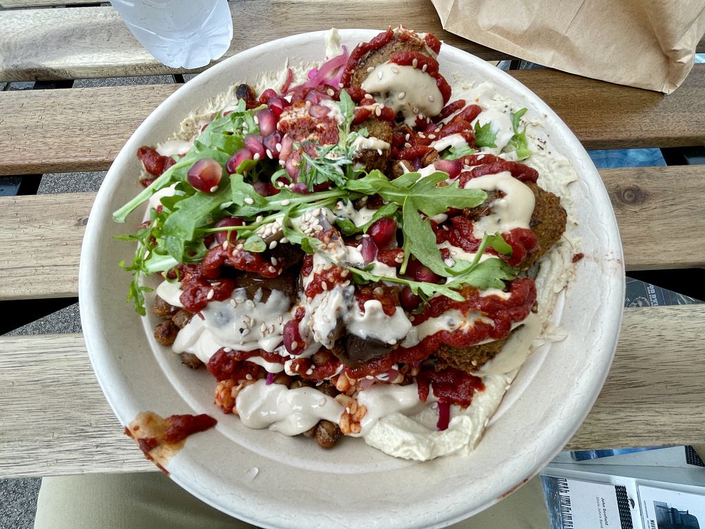 Sehr leckere Falafel Bowl, frische warme Falafel mit sehr leckerer Tahini Sauce, dazu Salat, Kohl, Aubergine, Bulgursalat und Kichererbsen. Die Pommes waren lecker gewürzt aber leider völlig versalzen, sodass man sie nicht aufessen konnte. Mayo ok.