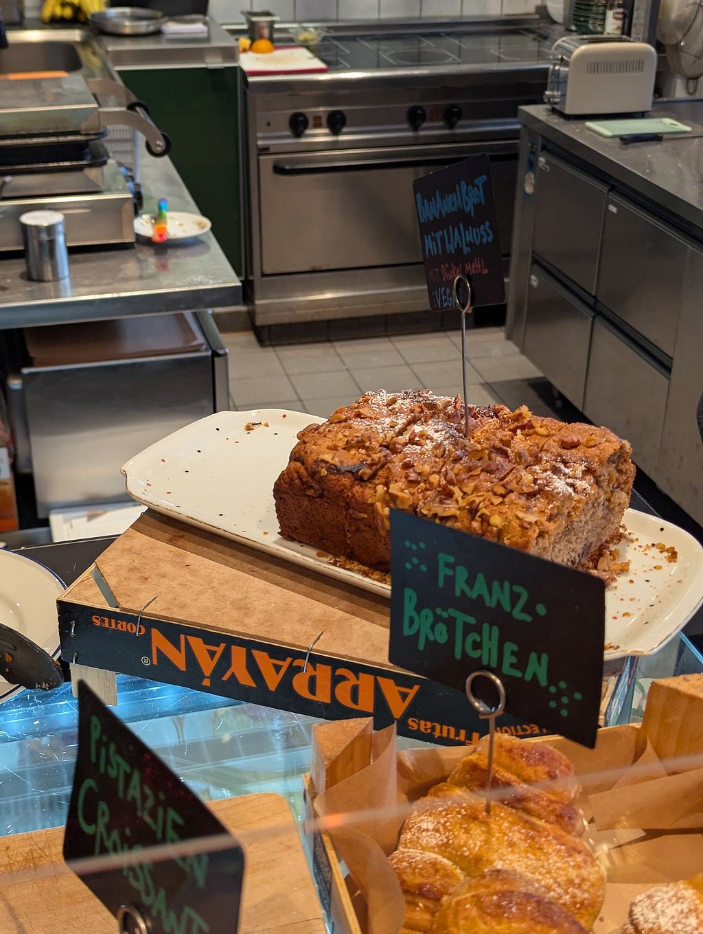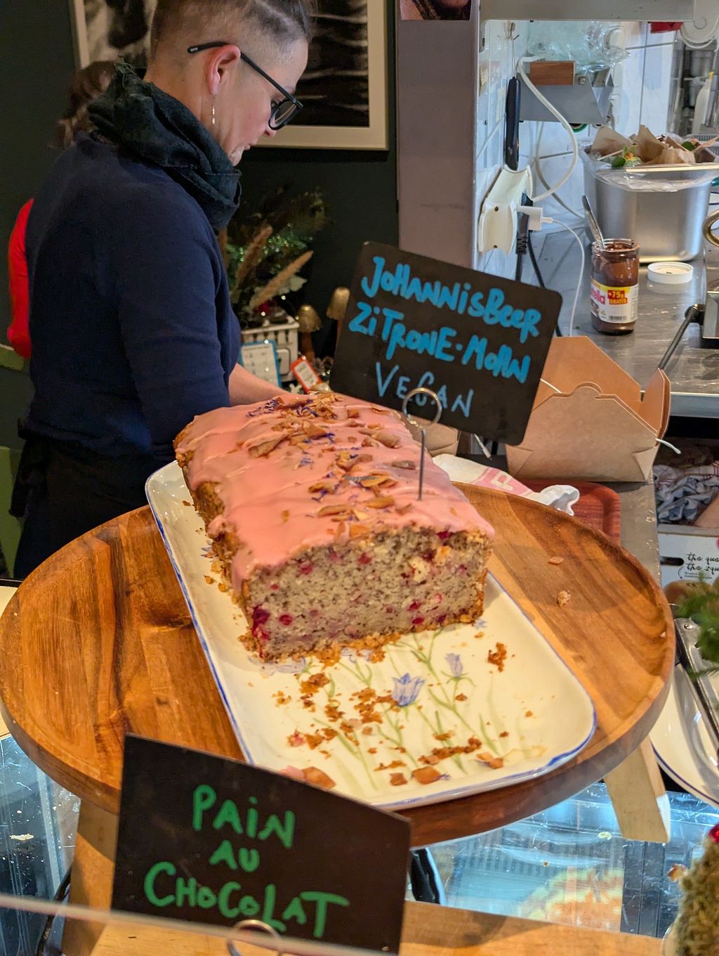 I met a friend over there. She Gas Bern there already several times. She said that they normally would have More Vegan cake options. They had Vegan croissants, Vegan banana bread, Vegan lemon cake and 2 more vegan cake options. The place was crowded in a nice way and the atmosphere was great.