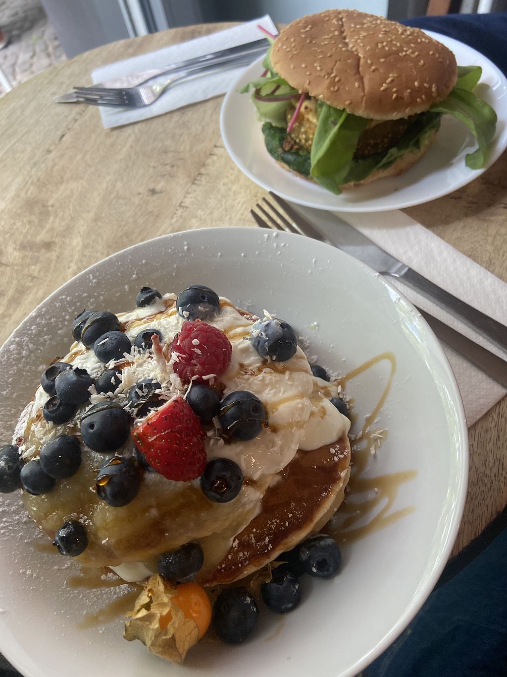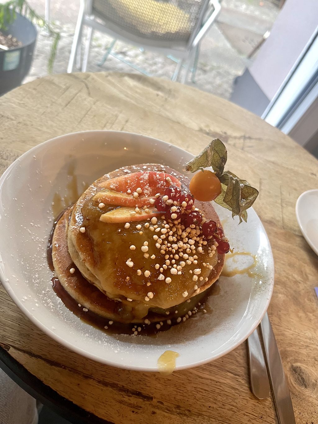 Ein schönes Café mit freundlichen Mitarbeitern. Als Alleinreisende wurde ich herzlich aufgenommen und habe ohne Reservierung sonntags einen Platz bekommen. Ich habe mich sehr auf die Pancakes gefreut, allerdings blieben sie etwas hinter meinen Erwartungen. Sie waren etwas trocken und bei wenigen Bananenscheiben und einer halben Erdbeere als einzigen Früchten fehlte mir leider die Frische. Gut geschmeckt hat es zwar, aber für diesen Preis würde ich mir mehr wünschen