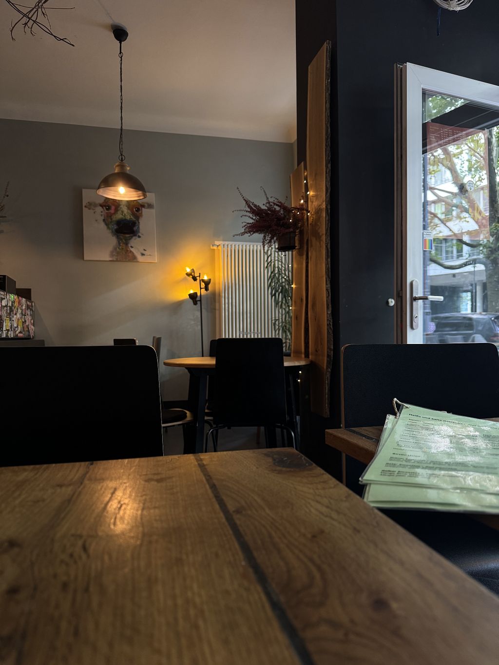 Vegan cafe offering breakfast, soup, bagels, wraps, sandwiches, salad, smoothies and baked treats. Since Jan 2015. Relocated from Birkenstr. 30. Hours are reported to vary, check ahead. Stops serving brunch at 2pm. Companion animal friendly. Cashless. Open Mon-Tue 10:00-15:00, Thu-Fri 10:00-15:00, Sat-Sun 10:00-17:00.