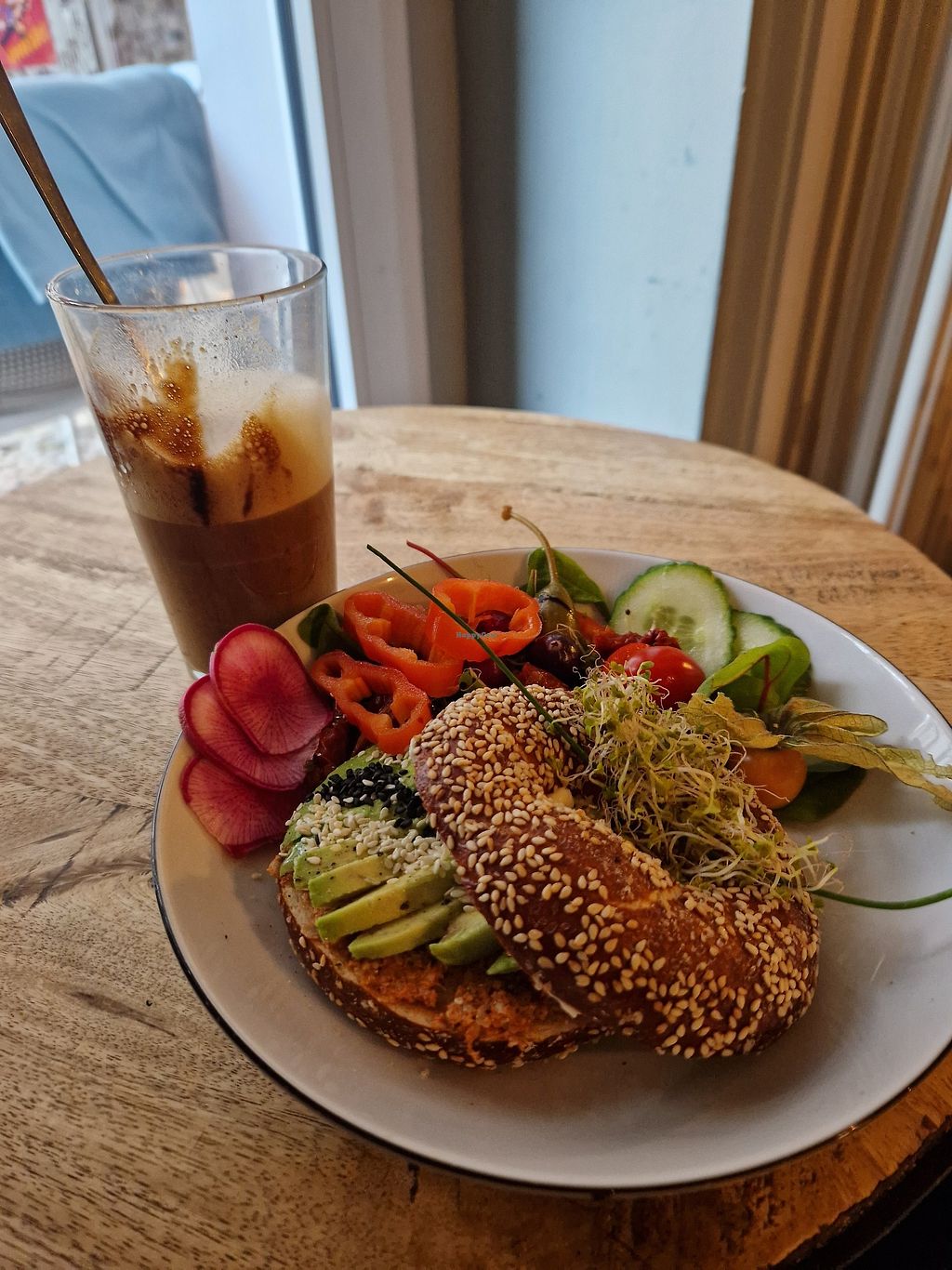 Gemütliches Café mit köstlicher Auswahl an Bagel, Wraps, Kuchen etc. Fabelhaft ist das Herzhafte Frühstück, irre Auswahl!!! Freundlicher schneller Service.