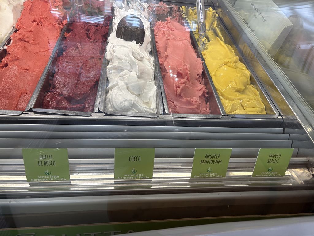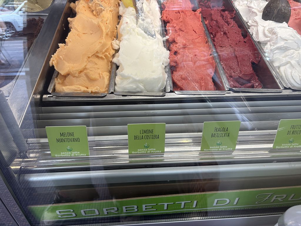 Lots of fruit sorbet and granita available plus incredible chocolate and pistachio. Vegan cones. Allergens clearly labelled. Good prices!