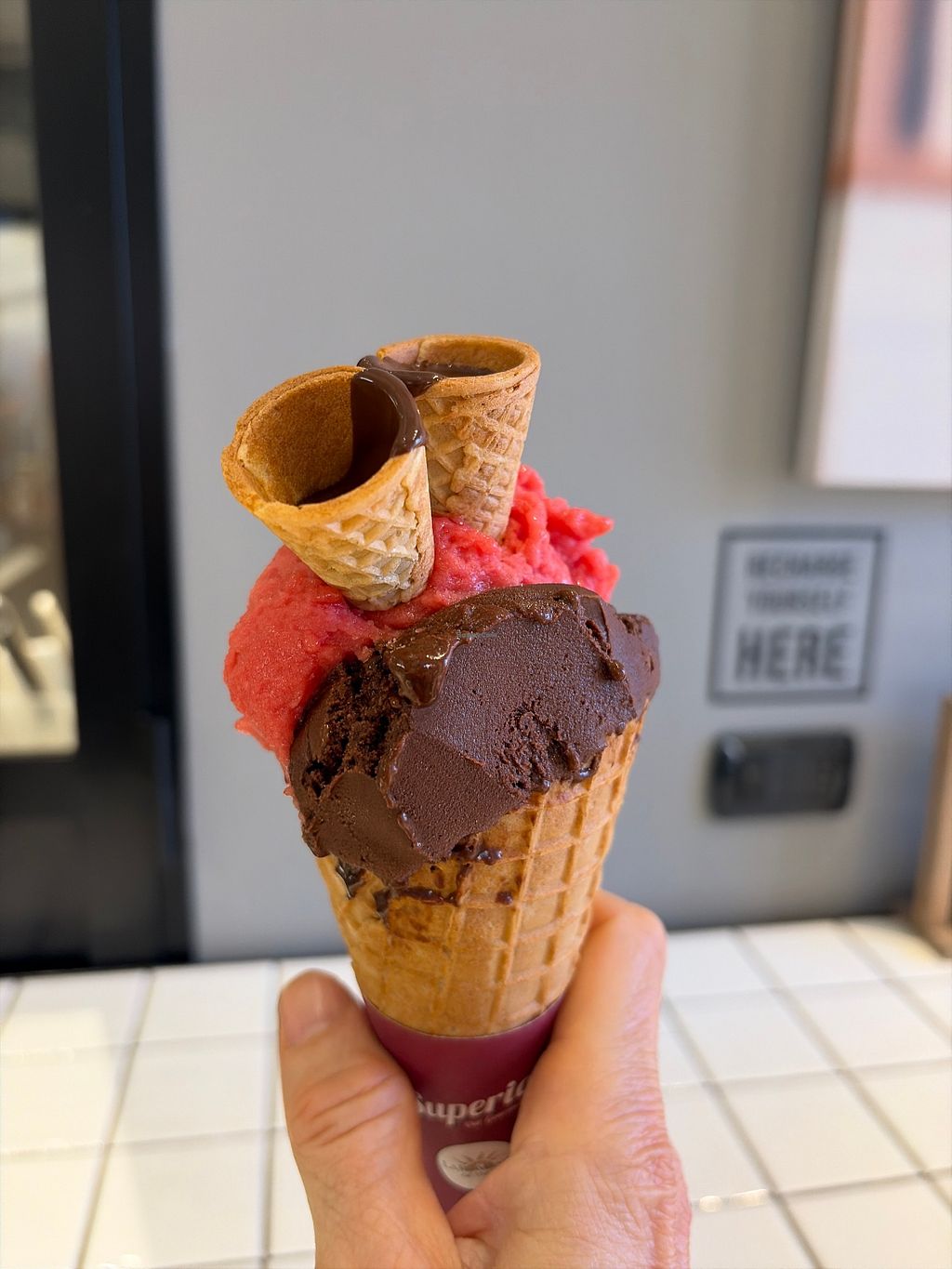 A very nice selection of vegan gelato. All but one of the cones are vegan too. ❤️ The gooey chocolate from the fountain is also vegan!