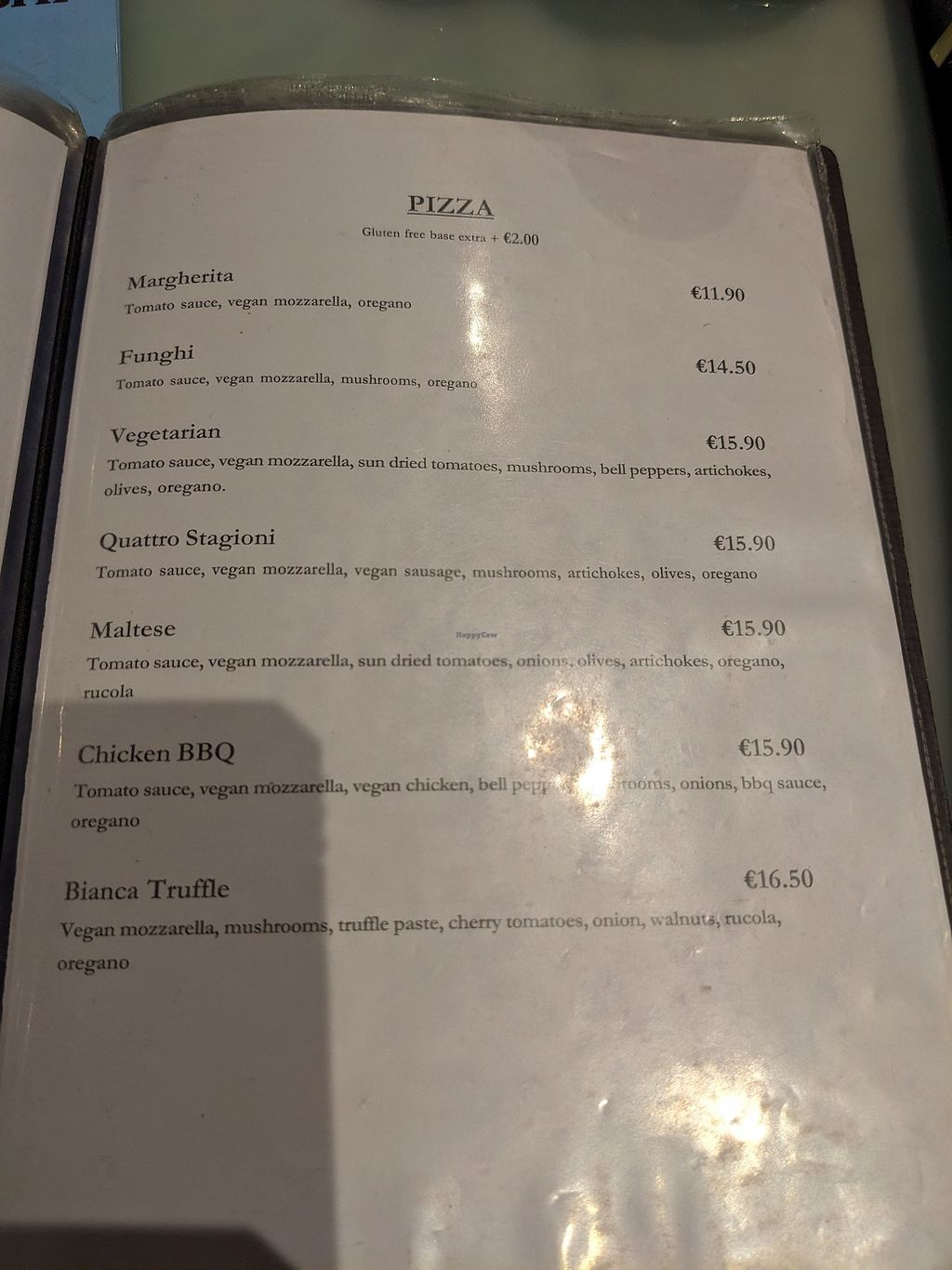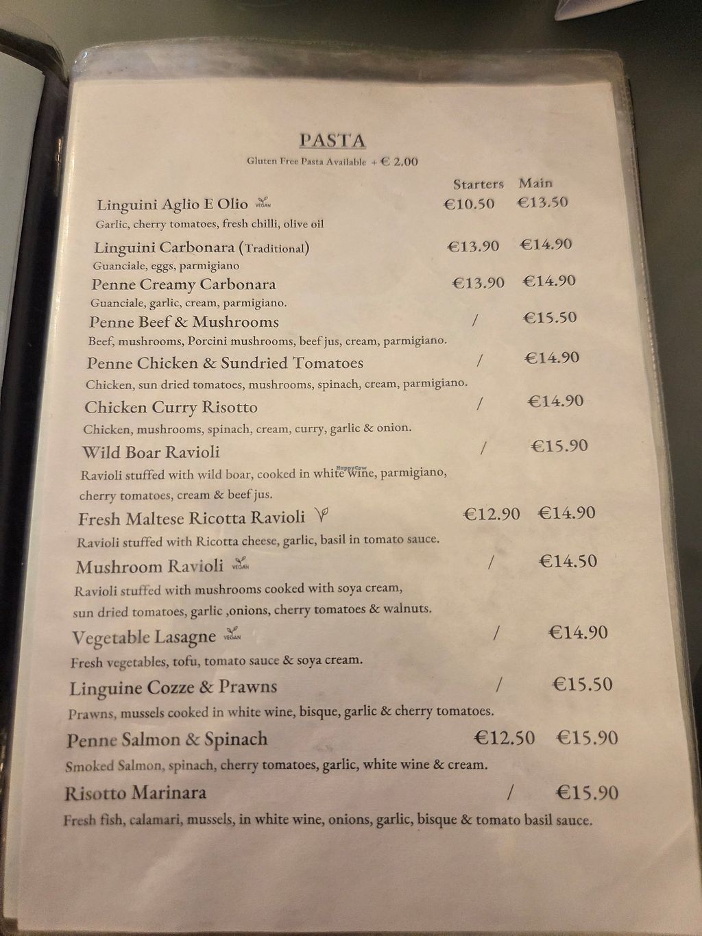 My husband and I went there for dinner yesterday and were very impressed with the amount of vegan options available. We felt truly spoiled for choice and when the food came through we were not disappointed! It was extremely good quality, and they were very accommodating with my food allergies, which is always a pain when eating out. We had the truffle penne and a delicious fresh orange juice. The portions were very generous (so I really made 2 meals out of that delicious pasta). The staff could not be more attentive and helpful, top customer service! We would recommend this place to anyone who had special dietary requirements, especially vegans. A must go if you are visiting Malta!