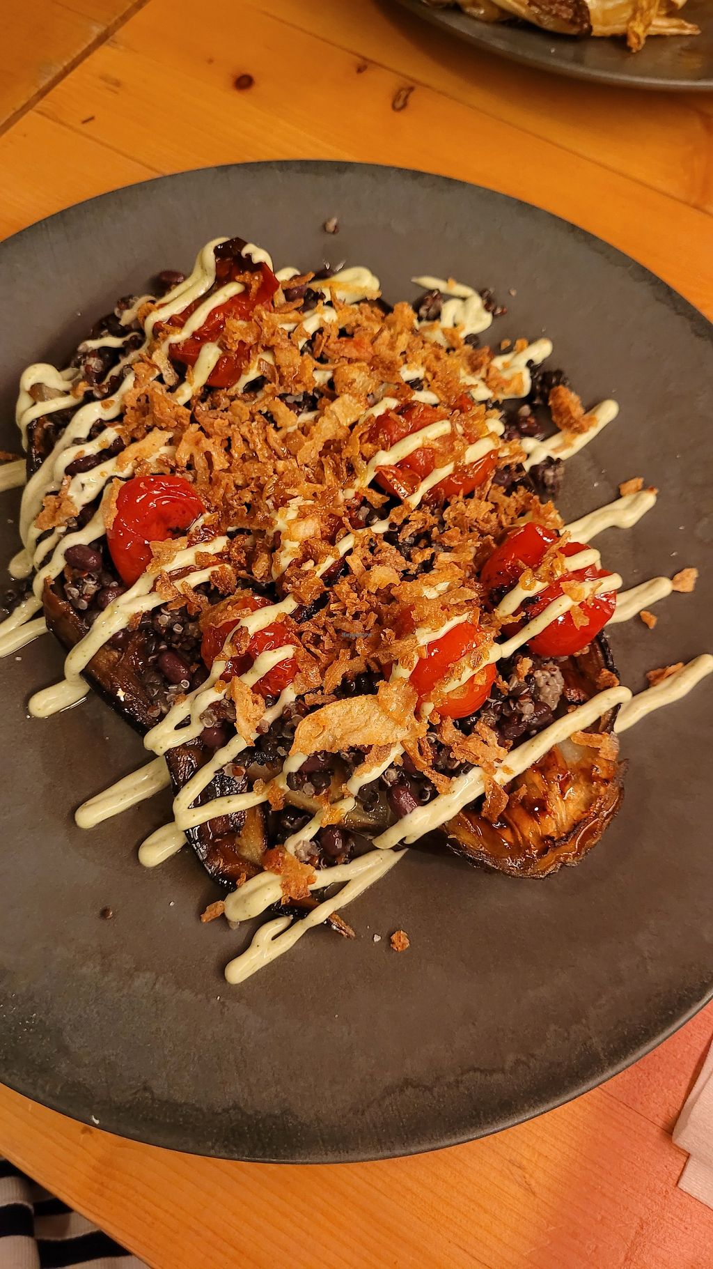 Eggplant, quinoa, aduki beans, cherry tomatoes, crispy onion, herbal m…