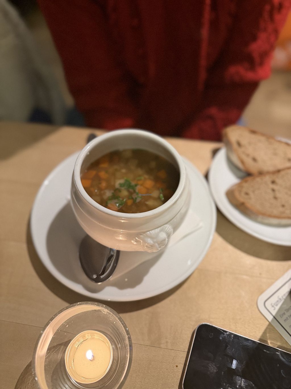 My omni boyfriend and I went here for lunch today. I had the vegan lentil stew and the dish was very good! It came with bread (and my boyfriend and I ordered a plate of french fries to share). It was just a little too salty for me, but combined with the bread it was fine. The atmosphere was good, service fast and we saw many locals eating there too.
