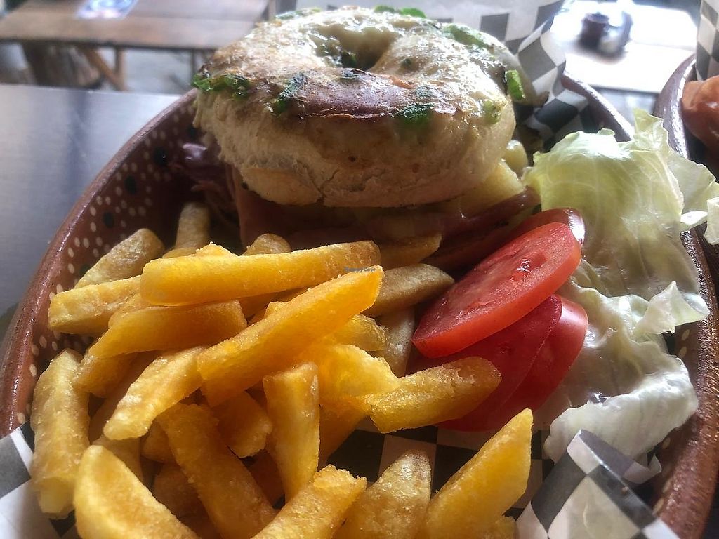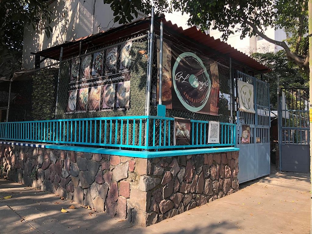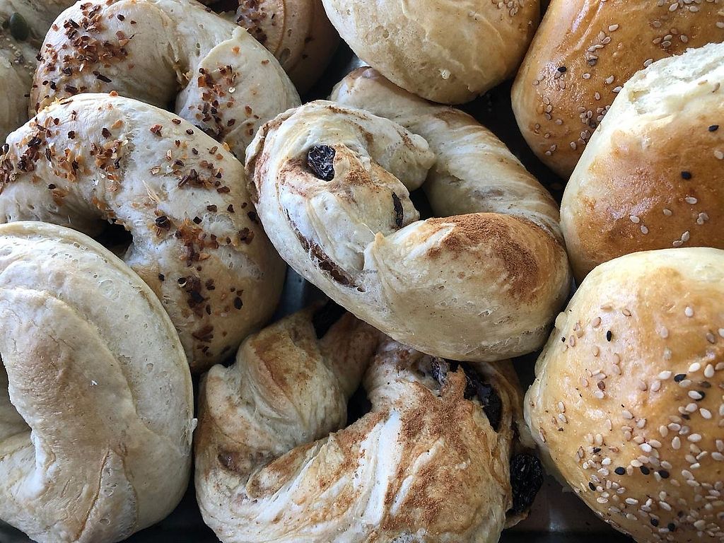 Serves meat, vegan options available. Bagel shop with vegan options for burgers and bagels. Open Tue-Sun 9:00am-5:00pm. Closed Mon.