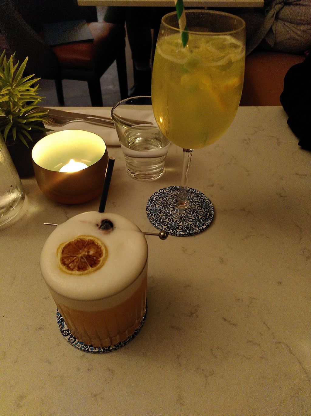 Whiskey sour, cucumber something (no alcohol will ever touch my table)