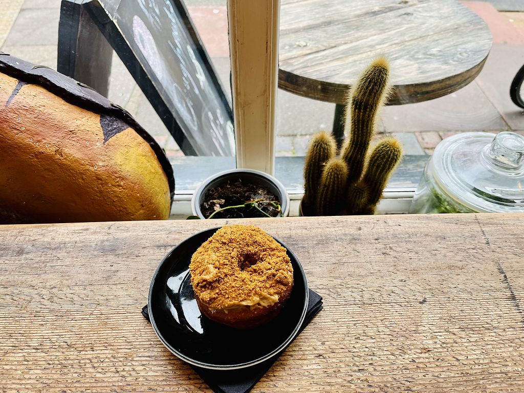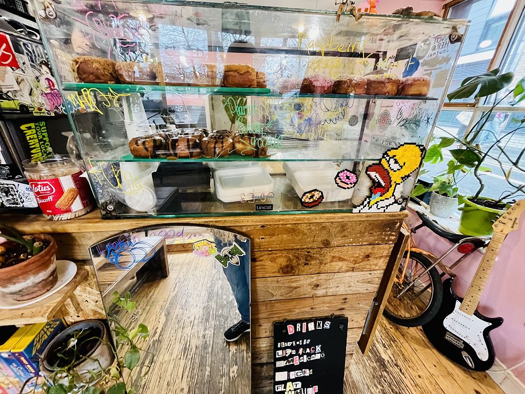 Being a rebel, I wanted a doughnut and coffee for breakfast. Glazed blew my mind! After saying hello to the cafe owner's dog companion, I ordered a latte and a fresh warm doughnut with strawberry glaze sprinkled with toasted coconut. It's hard to describe the intriguing vibe of this place. It's cosy with timber and indoor plants, featuring subversive art and a great selection of skateboarding literature. The music is trippy. Price was reasonable. Note that they exclusively use oat milk. Everyone is relaxed and friendly. It's an experience and definitely worth a visit if you're in Brighton!