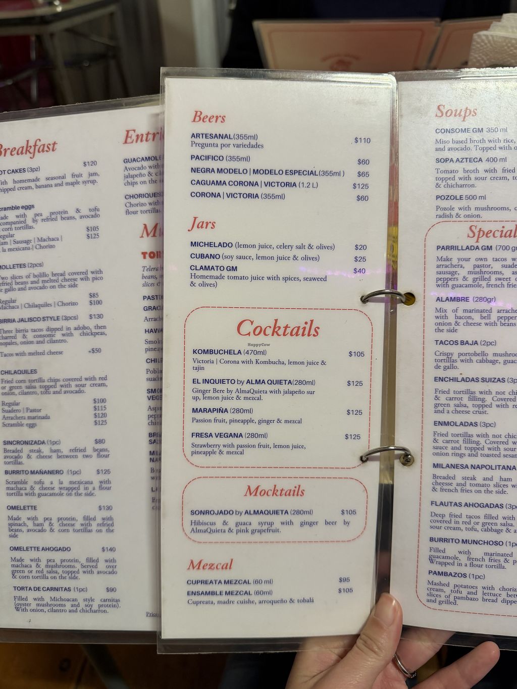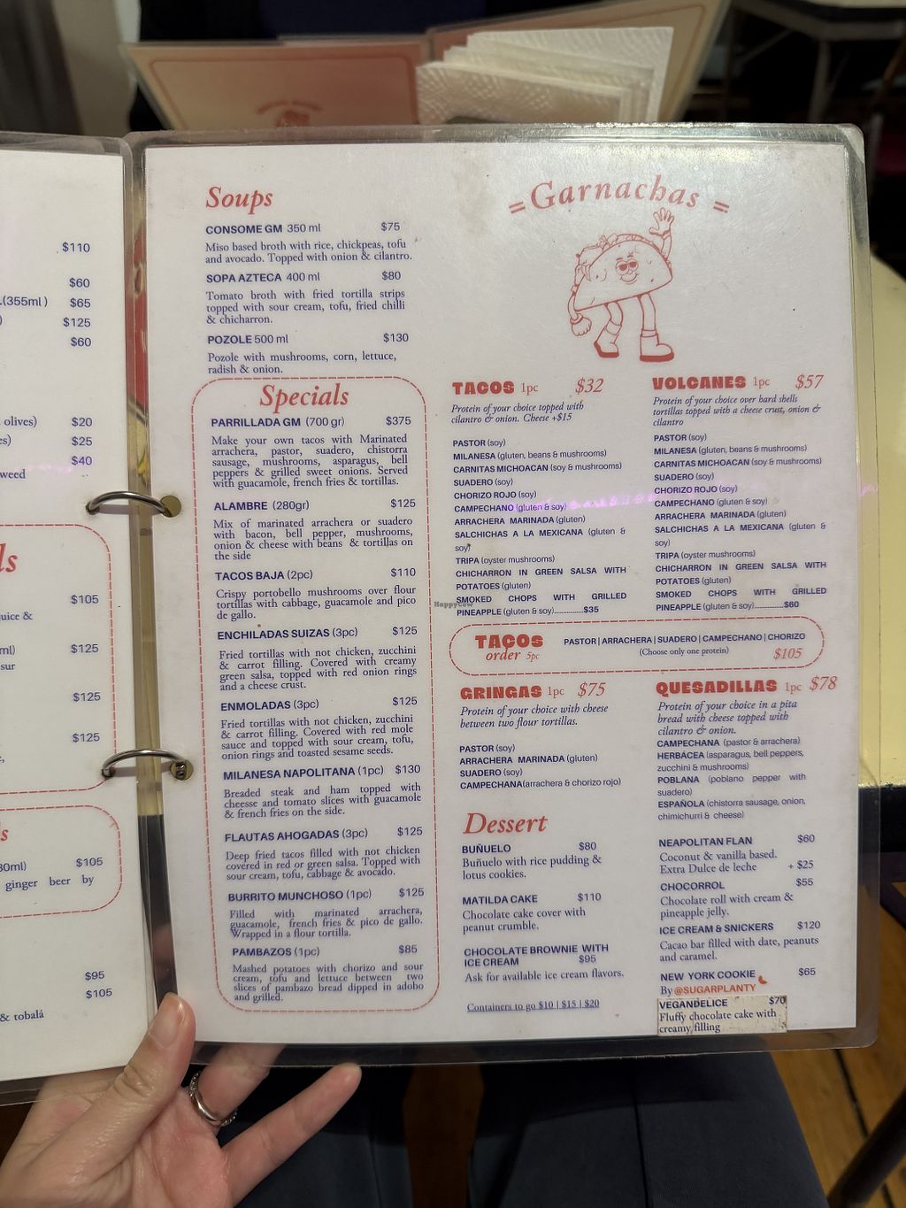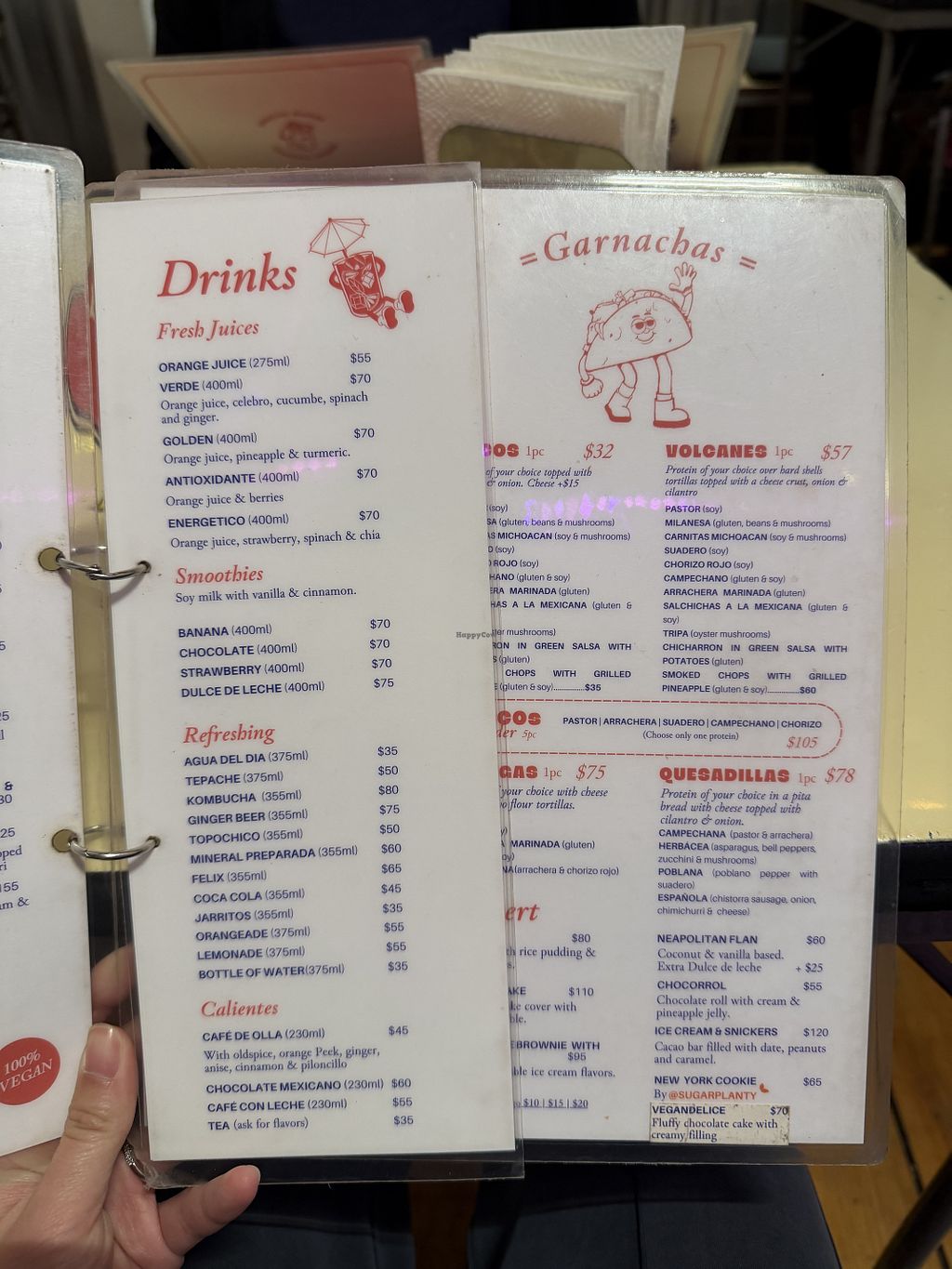 Affordable authentic Mexican cuisine veganized, including street tacos and desserts. Menu items include alambre (veggies with wheat bacon); red chorizo (mushrooms & chickpeas); chicharron in green sauce made of wheat; gringa (cheese & pastor); lentil soup. Can add potato or tapioca cheese to anything. Has fresh fruit water and sodas. Order via third party app. Open Mon-Sat 9:00am-11:00pm, Sun 9:00am-10:00pm.