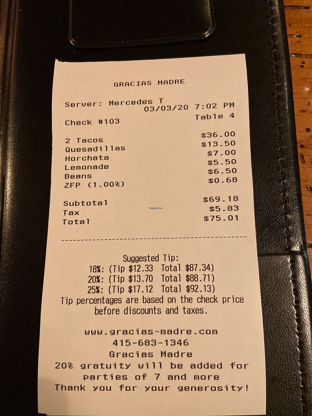 Chose Gracias Madre based on Happy Cow and Yelp reviews but left disappointed. The food tasted average at best and it was overpriced based on the quality and quantity.