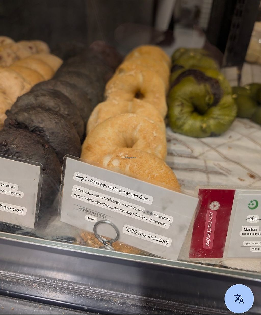 I was doubtful about that this fancy bakery would carry vegan items, but they have bagels with chestnut; and read bean and kinao (soy flour) filling. Possibly more vegan items are offered, the allergens are at display. The bagels were possibly best bagels I had in the latest time, and no doubt the most original ones!