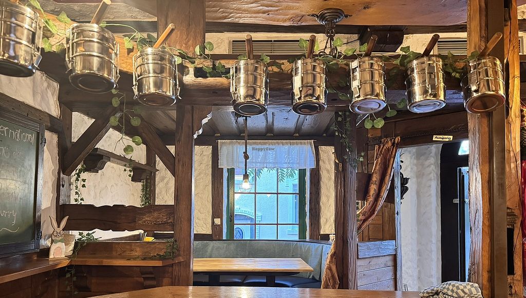 How nice to have an Indian vegetarian restaurant in Freiburg, especially one which is eco-minded! For starters, mains and breads, there are plenty of vegan options to choose from and they are clearly labelled on the menu. Unfortunately, there are no vegan lassis or desserts. The food is tasty, the staff is welcoming and the portion size just right. However, the setting isn't nice - it' s a dark, old pub, with little day light, heavy dark wooden furniture (not comfortable for sitting), old-fashioned lighting fixtures... There is a small terrace though.