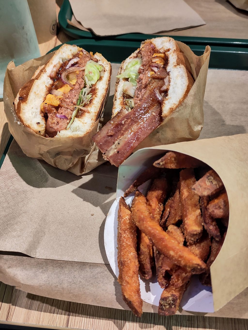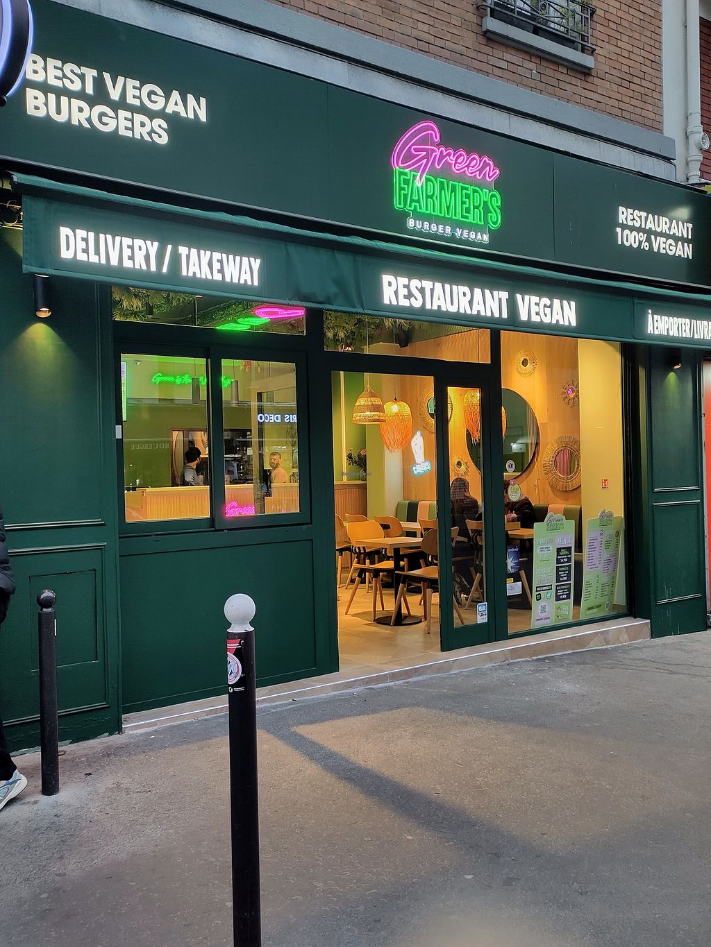 Green Farmer's is a fully vegan fast-food chain with this being its second location in Paris. The menu offers a wide variety of plant-based burgers (including green bacon, green chicken, and green fish styles), as well as hot dogs, fries, salads, bowls, desserts, and smoothies. Catering services are also available. Open Mon-Thu 11:00-23:00, Fri-Sat 11:00-00:00, Sun 11:00-23:00.
