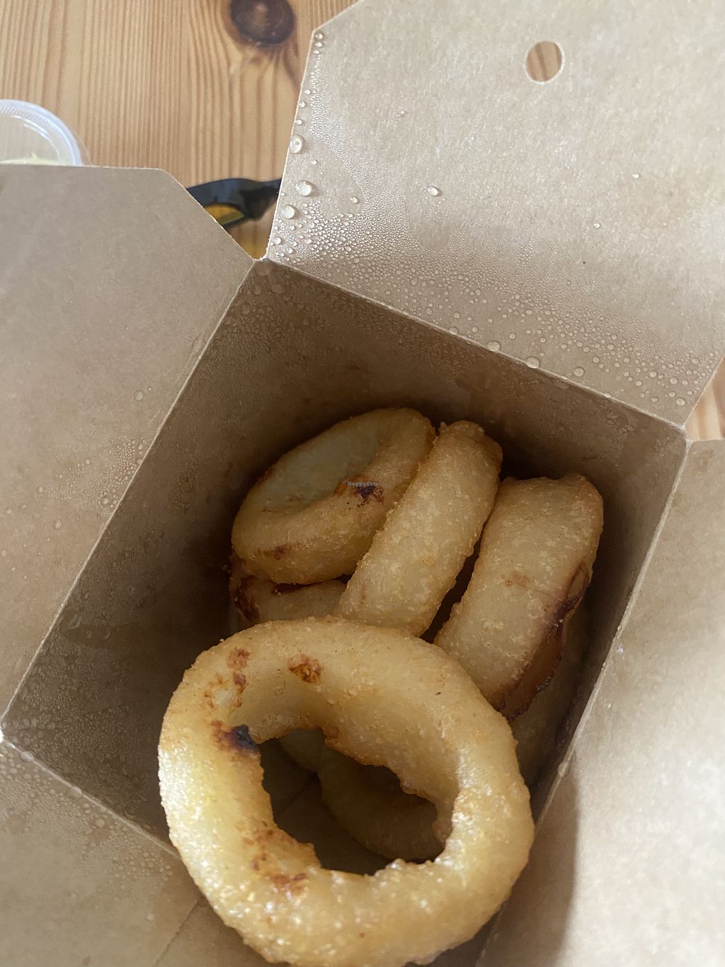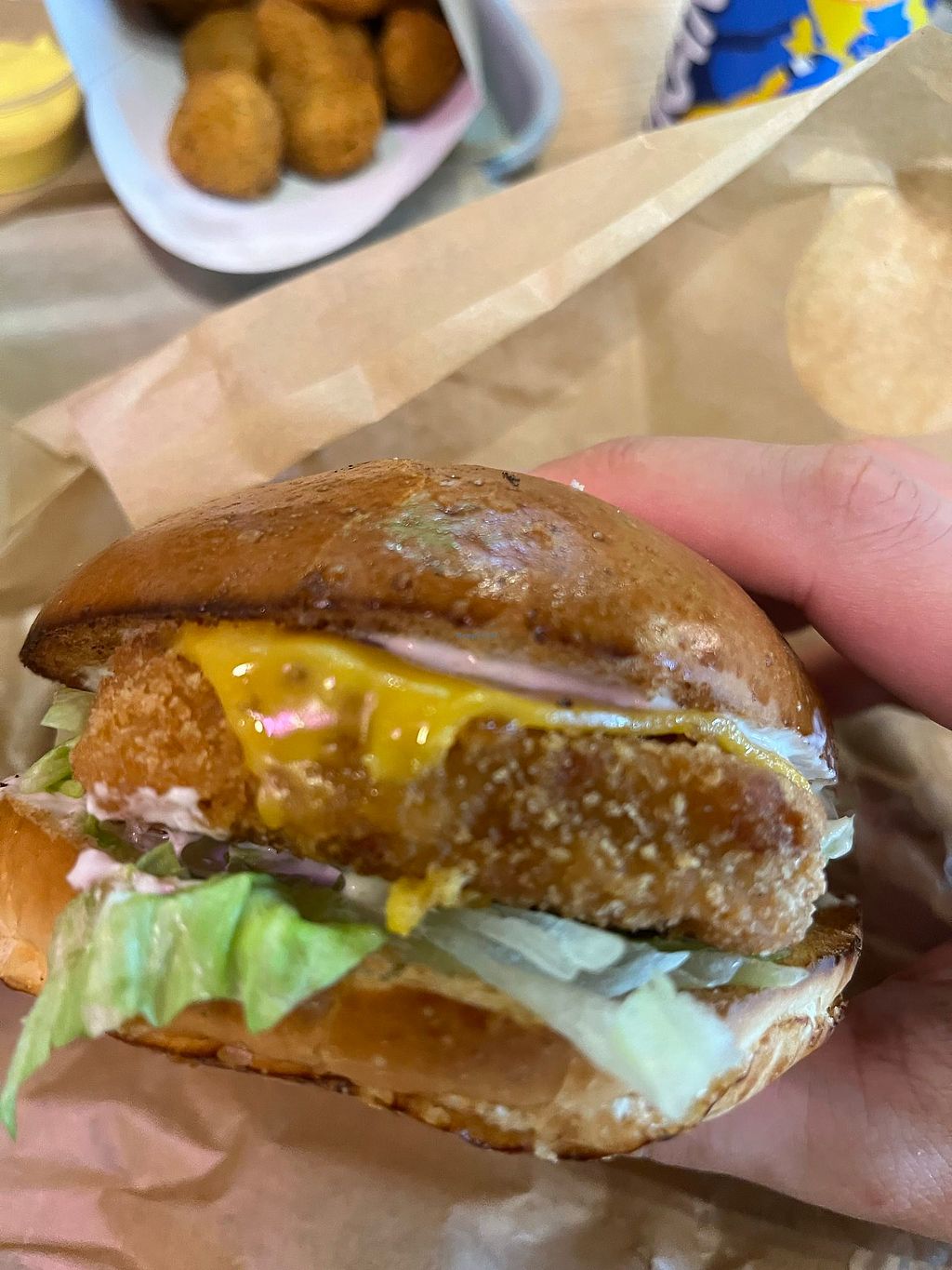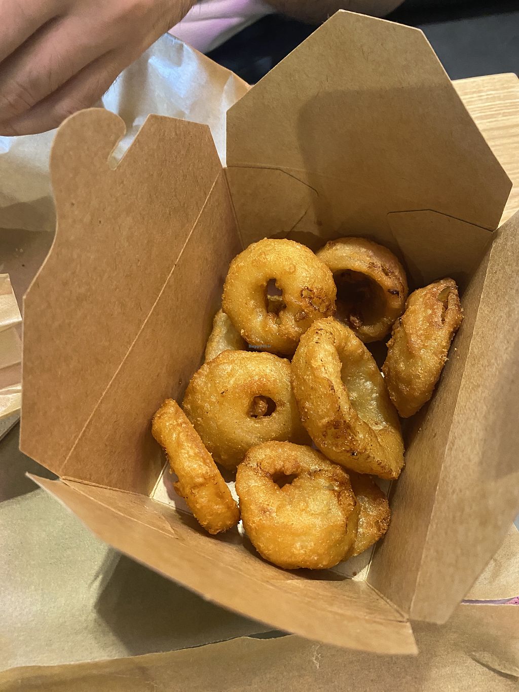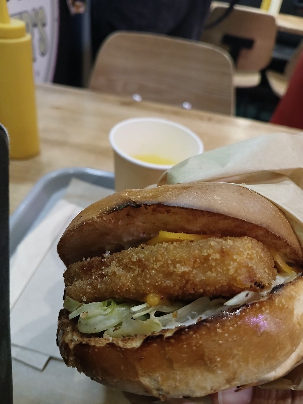 Provei do burger "smash" e do sabor (sem) "peixe", e de anéis de cebola e couve-flor fritas como acompanhamento. Muito bom mesmo.